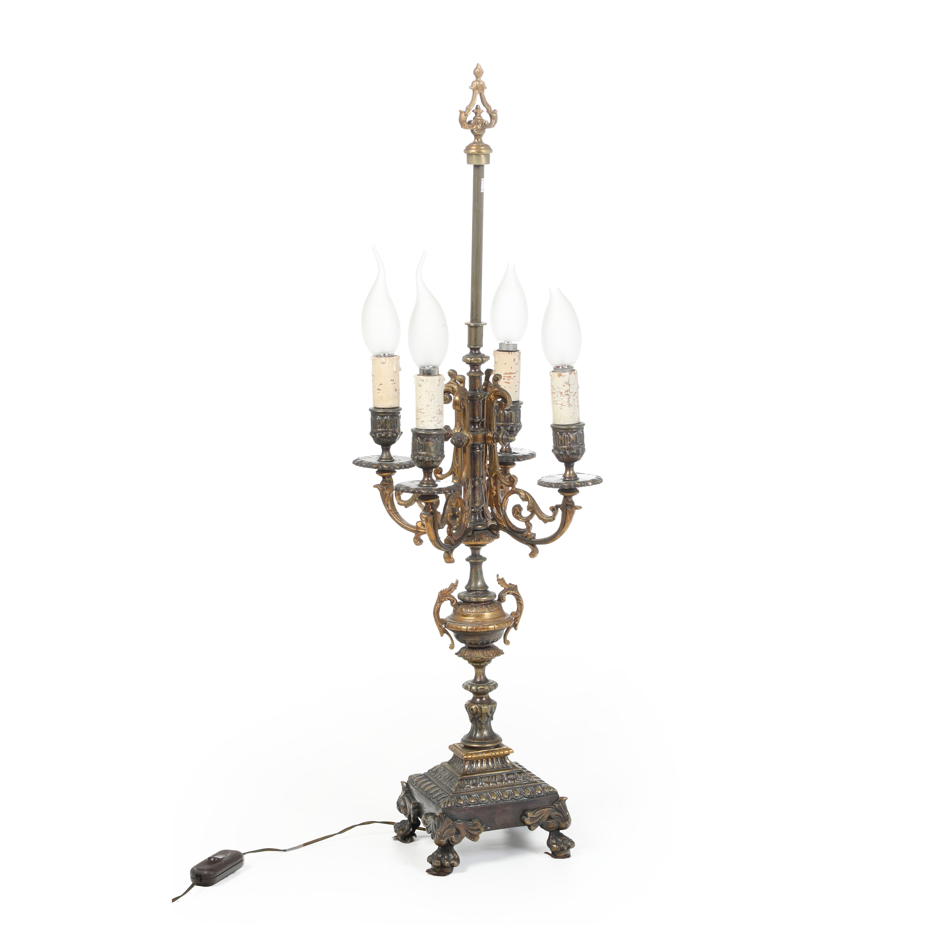 A quattro luci, bracci a volute, fusto a urna, piedi ferini, decori fitomorfi a rilievo