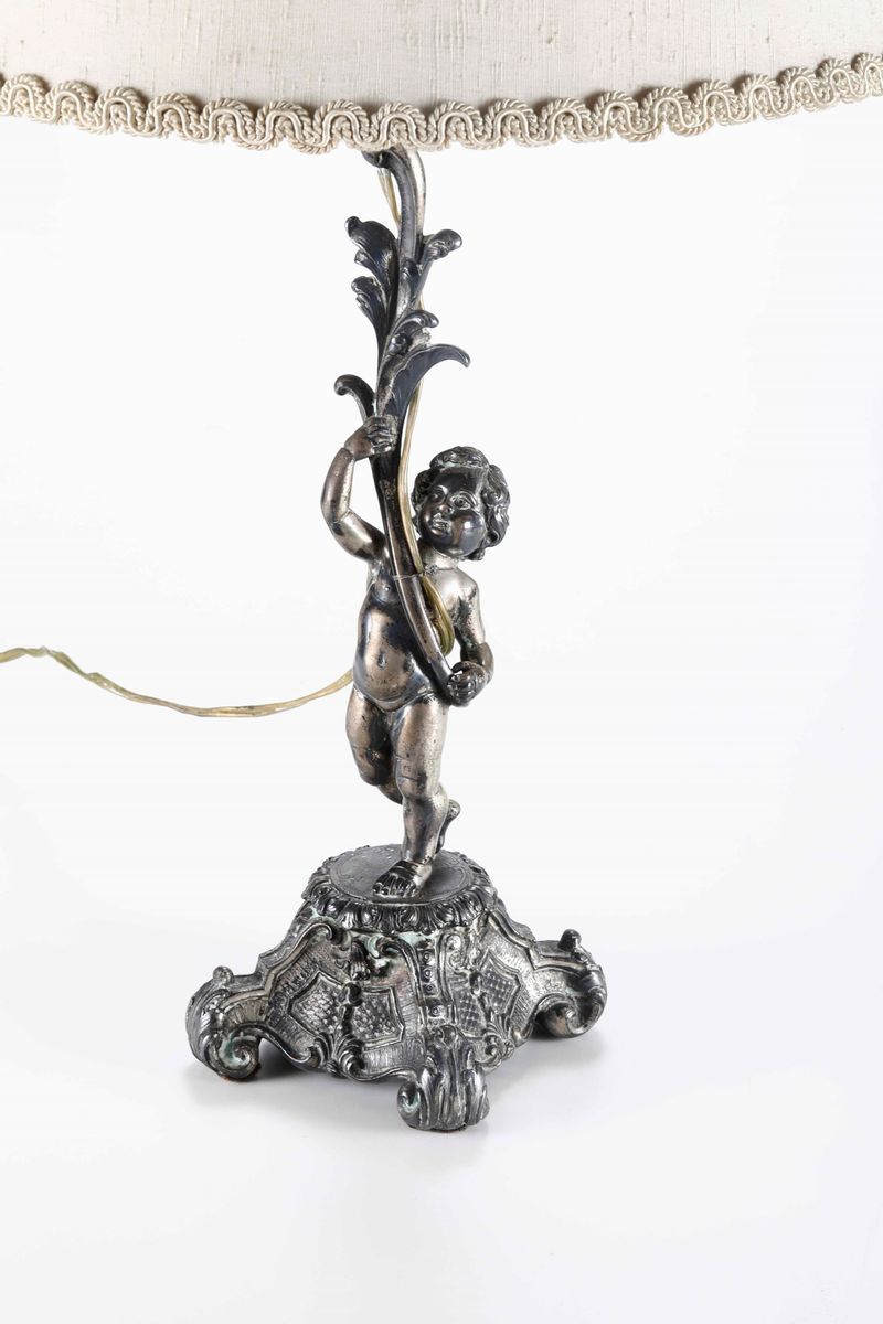 Candeliere con putto in metallo argentato. Montato a lampada. Stile ‘700