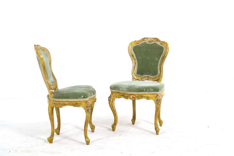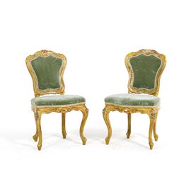 Coppia di poltroncine in legno intagliato, laccato e dorato. XVIII-XIX secolo
