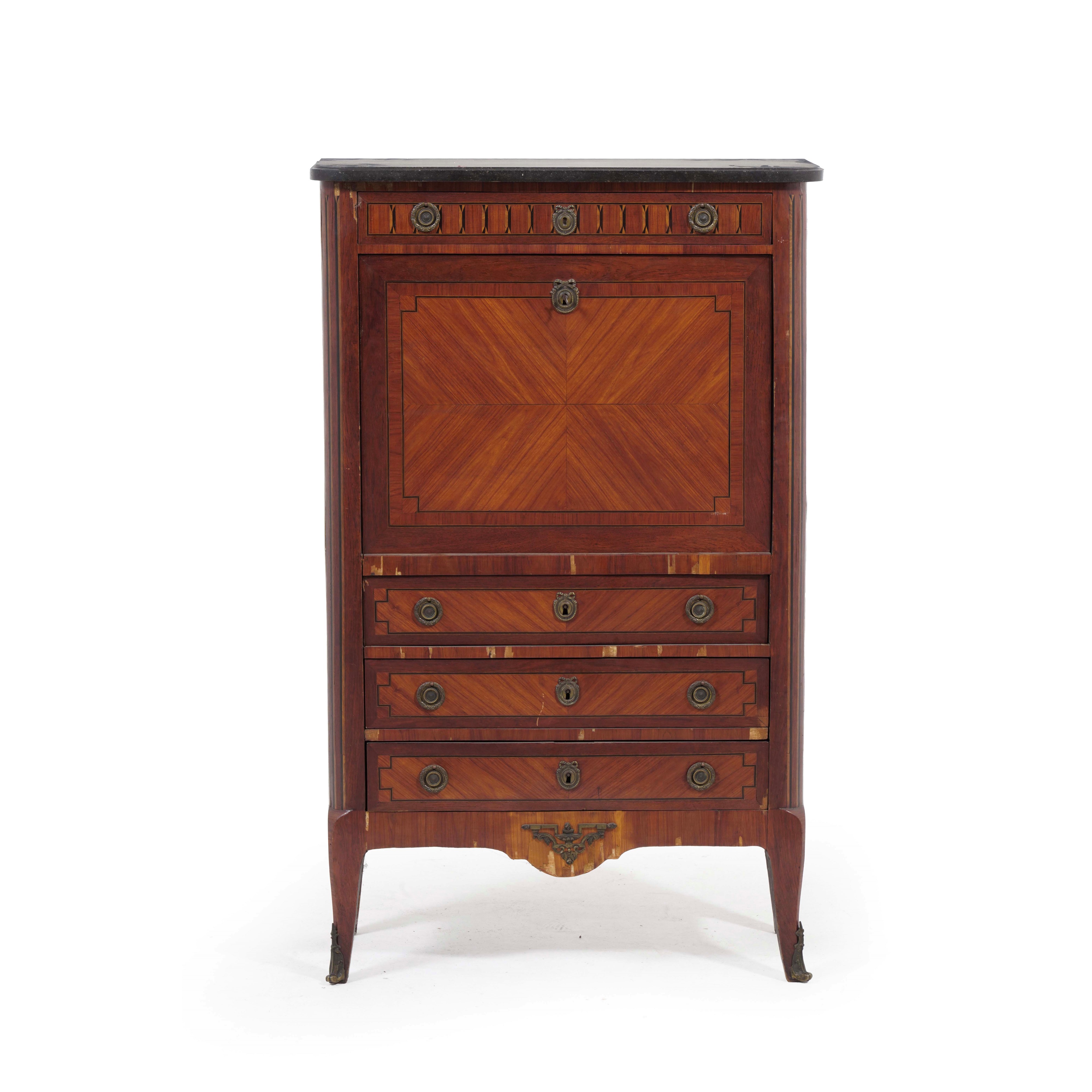 Secretaire lastronato ed intarsiato in vari legni. XVIII secolo