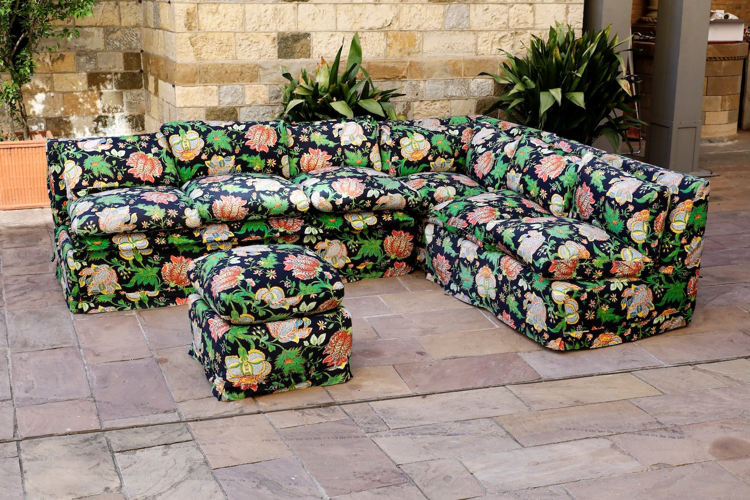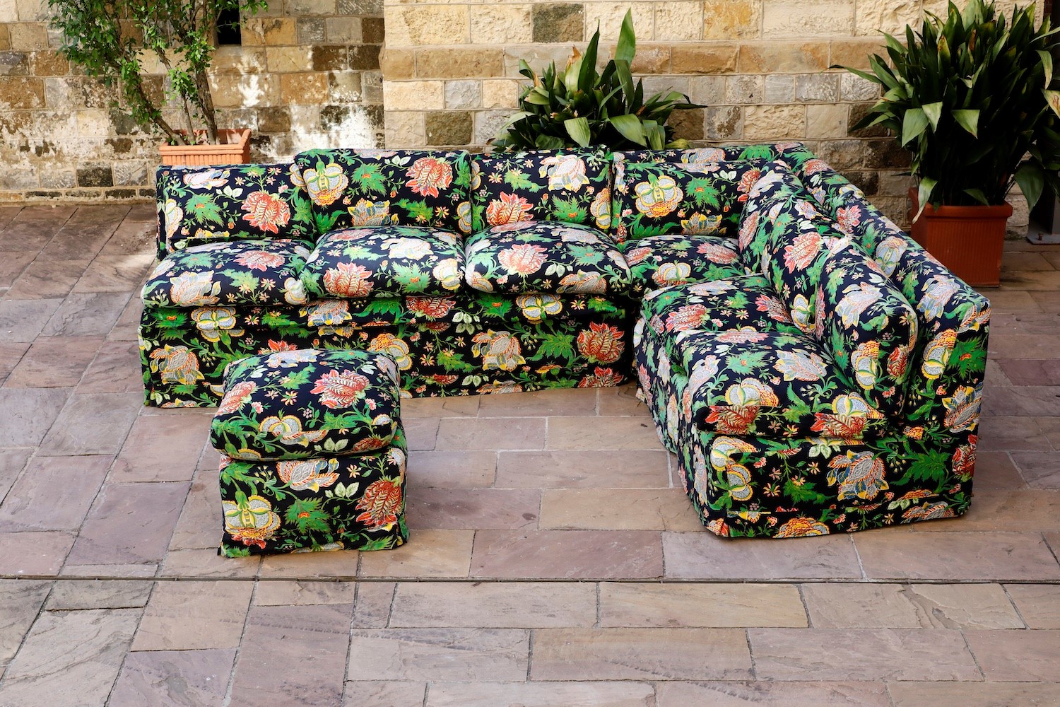 Divano componibile ad angolo con con tessuto floreale e pouf