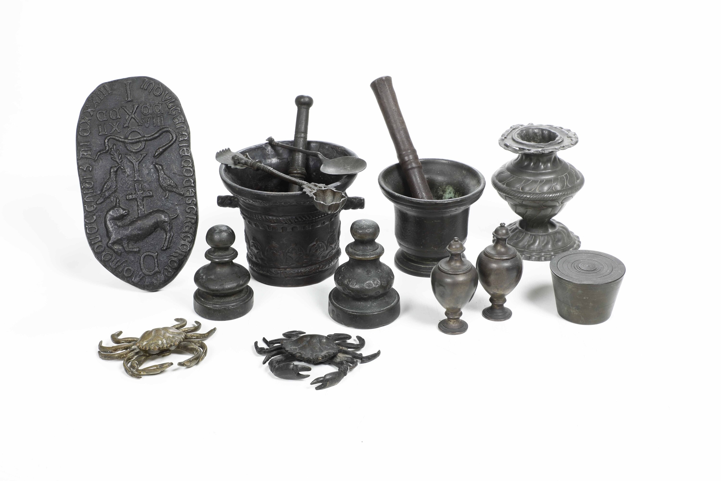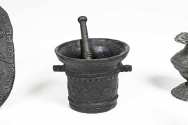 Tra cui due mortai con pestello, un vasetto, un rilievo decorativo, due granchi, alcuni pesi ed elementi decorativi