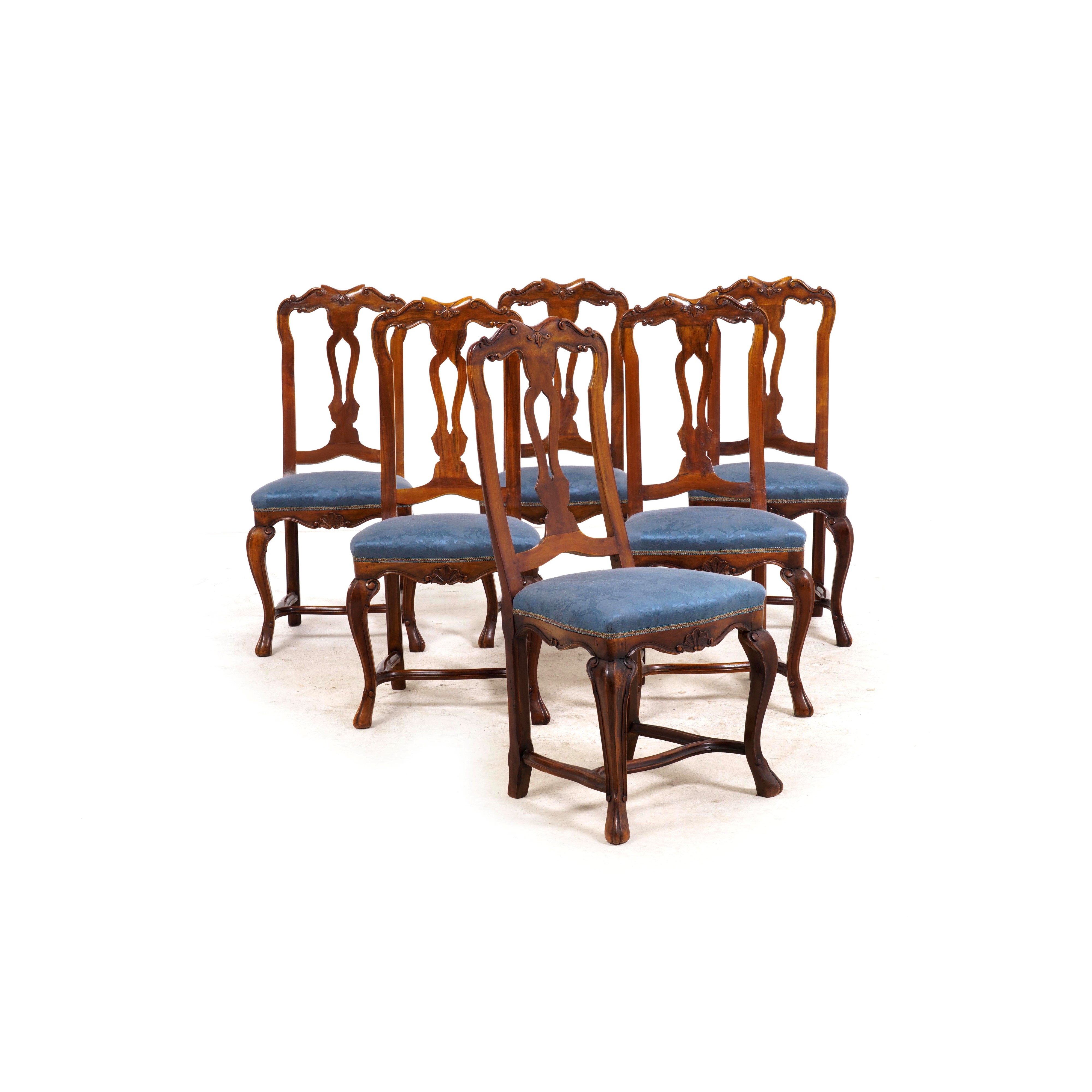 Gruppo di sei sedie in noce intagliato stile Luigi XV. XX secolo