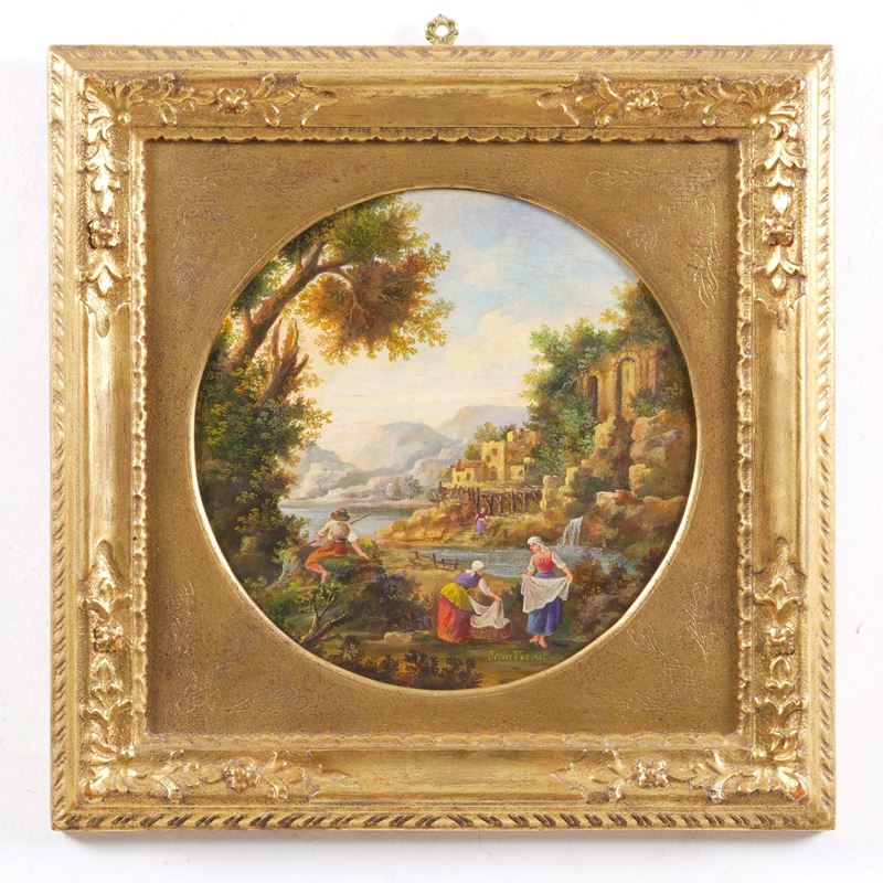 Pittore del XIX-XX secolo Paesaggio con lavandaie