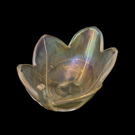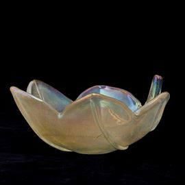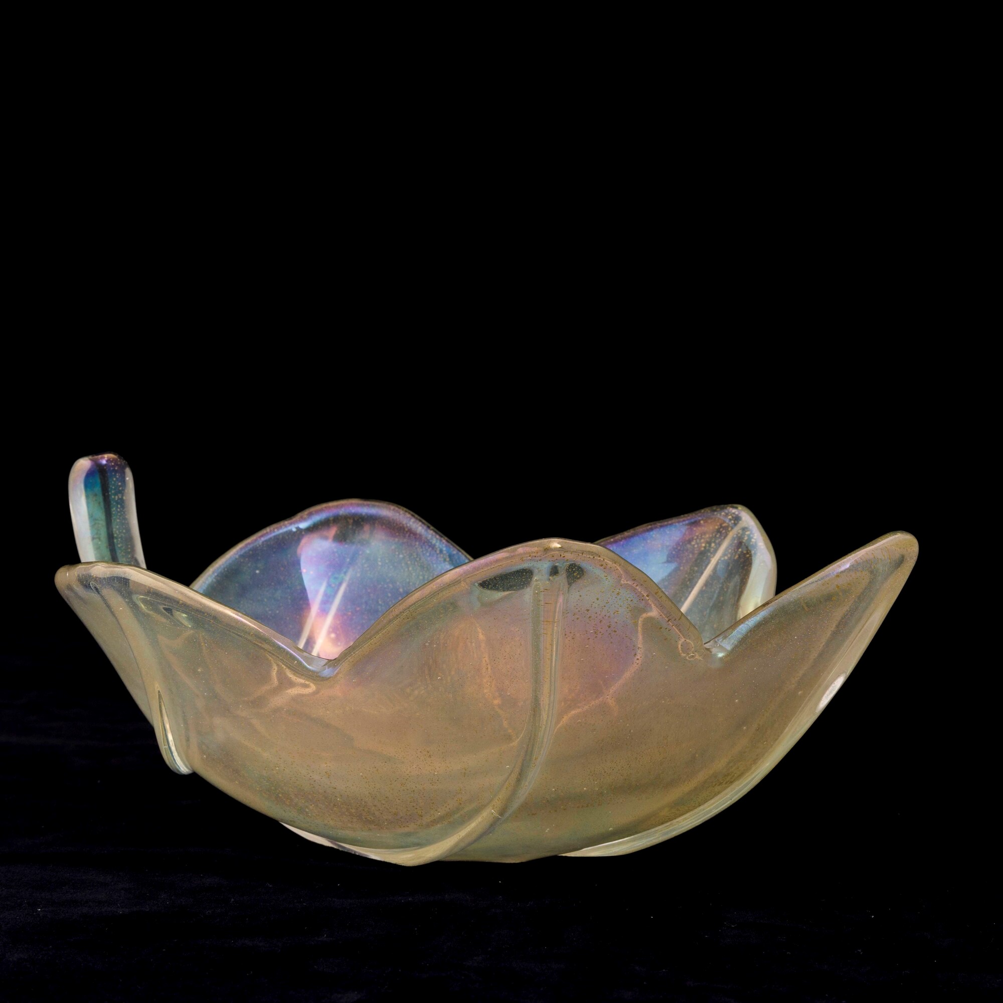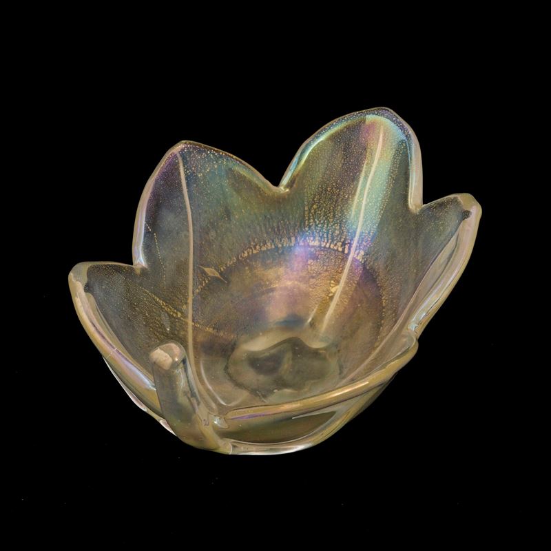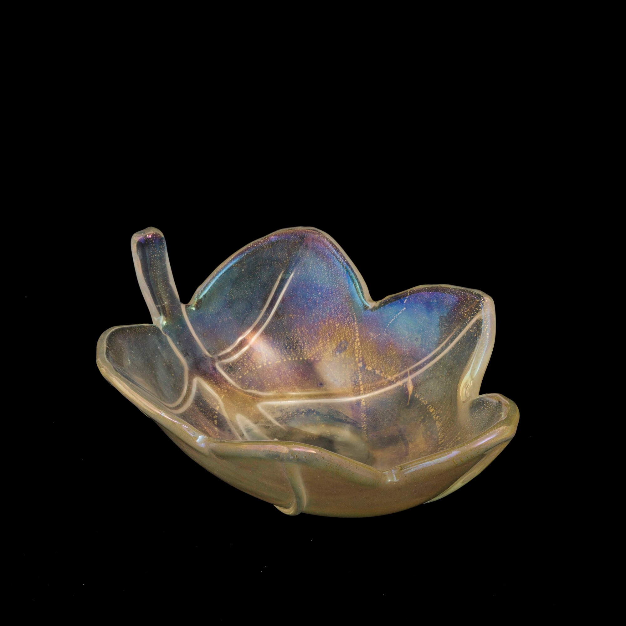 Centrotavola a forma di foglia con costolature applicate e foglia oro. Superficie interamente iridata.