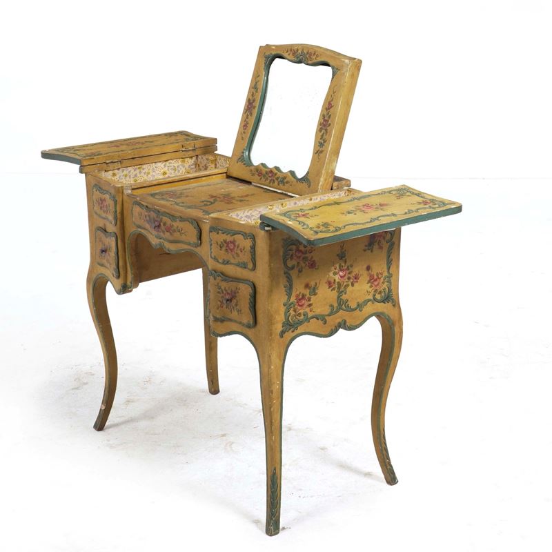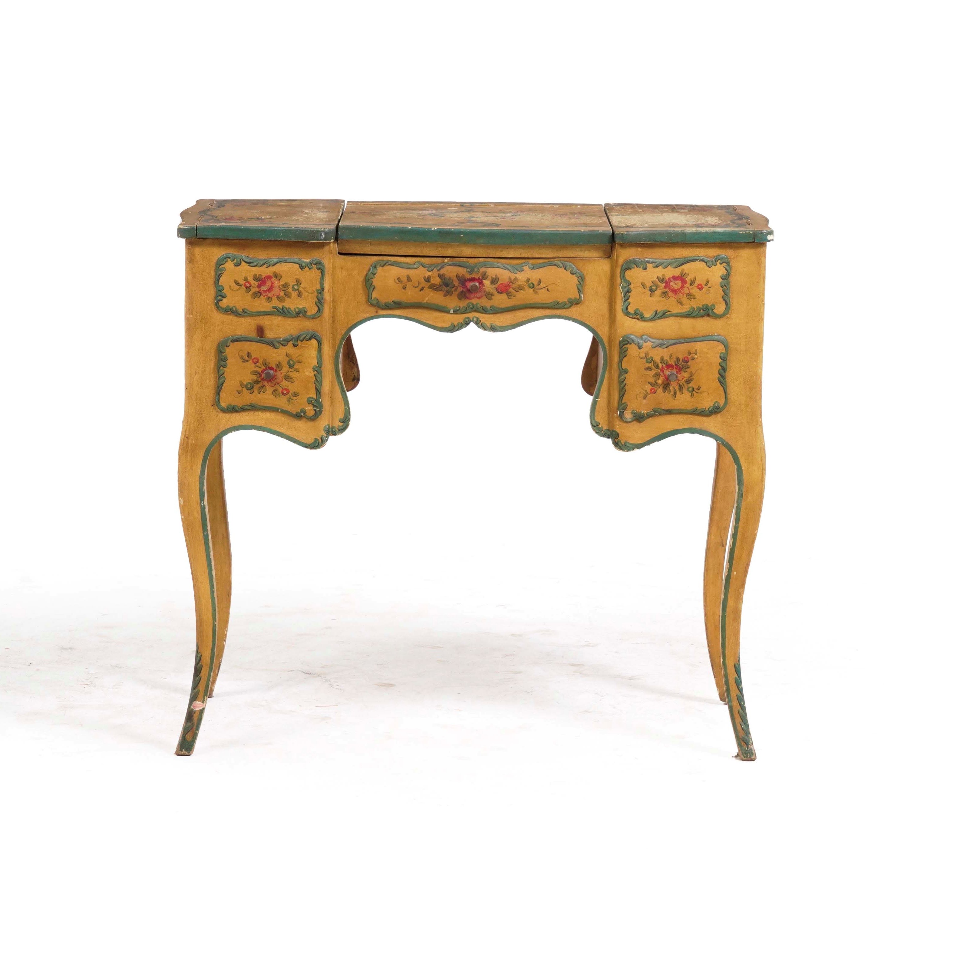 Piano sagomato con scomparti laterali e piano di scrittura centrale tutti apribili a ribalta, due cassettini laterali, gambe mosse, decoro floreale