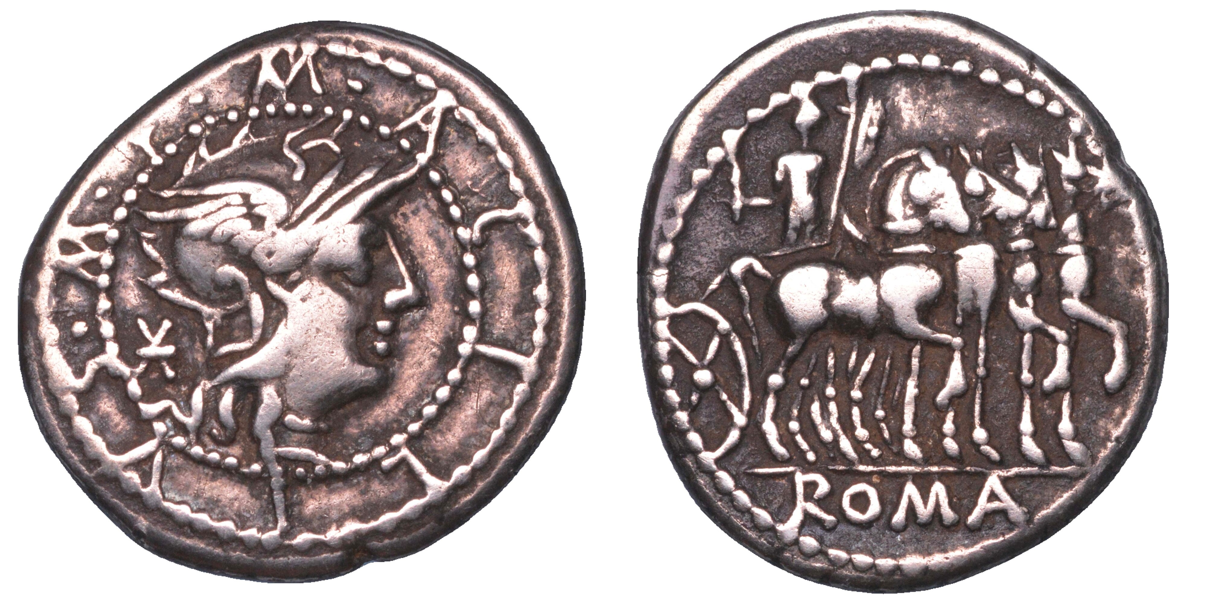 Testa di Roma con elmo a d.; marchio di valore X a s.; intorno, leggenda all'interno di due cerchi concentrici di perline. R/ Ercole su quadriga, in esergo, ROMA. Cr. 255/1. Syd. 511. gr. 3,73 Diam. mm. 19,31. Arg. MB