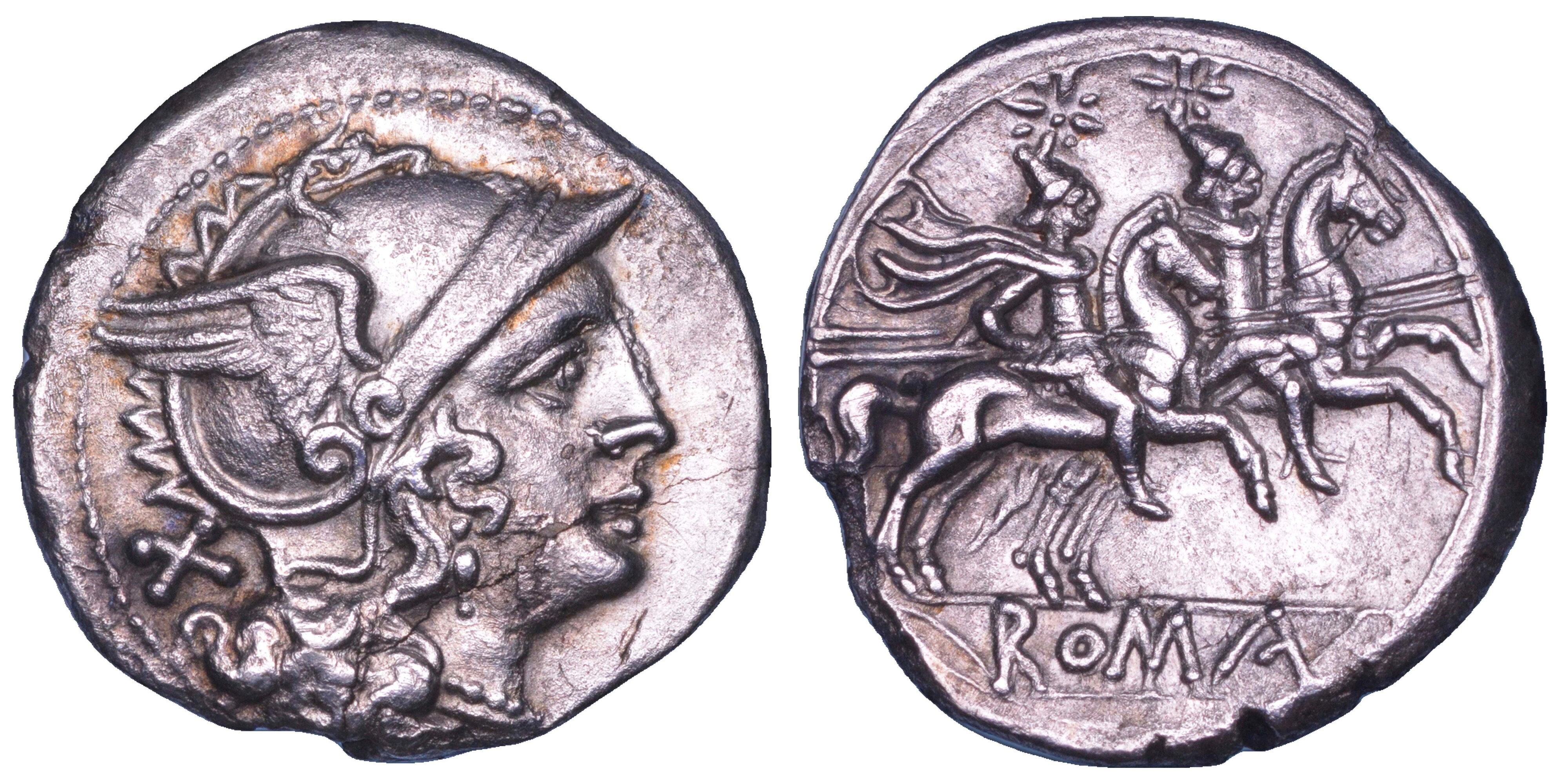 Testa elmata della dea Roma a d. R/ I Dioscuri affiancati a cavallo verso d. Bab. 2. Cr. 44/5. Syd. 168. g. 3,26. Diam. mm. 18,88. Arg. Frattura superficiale. q.BB