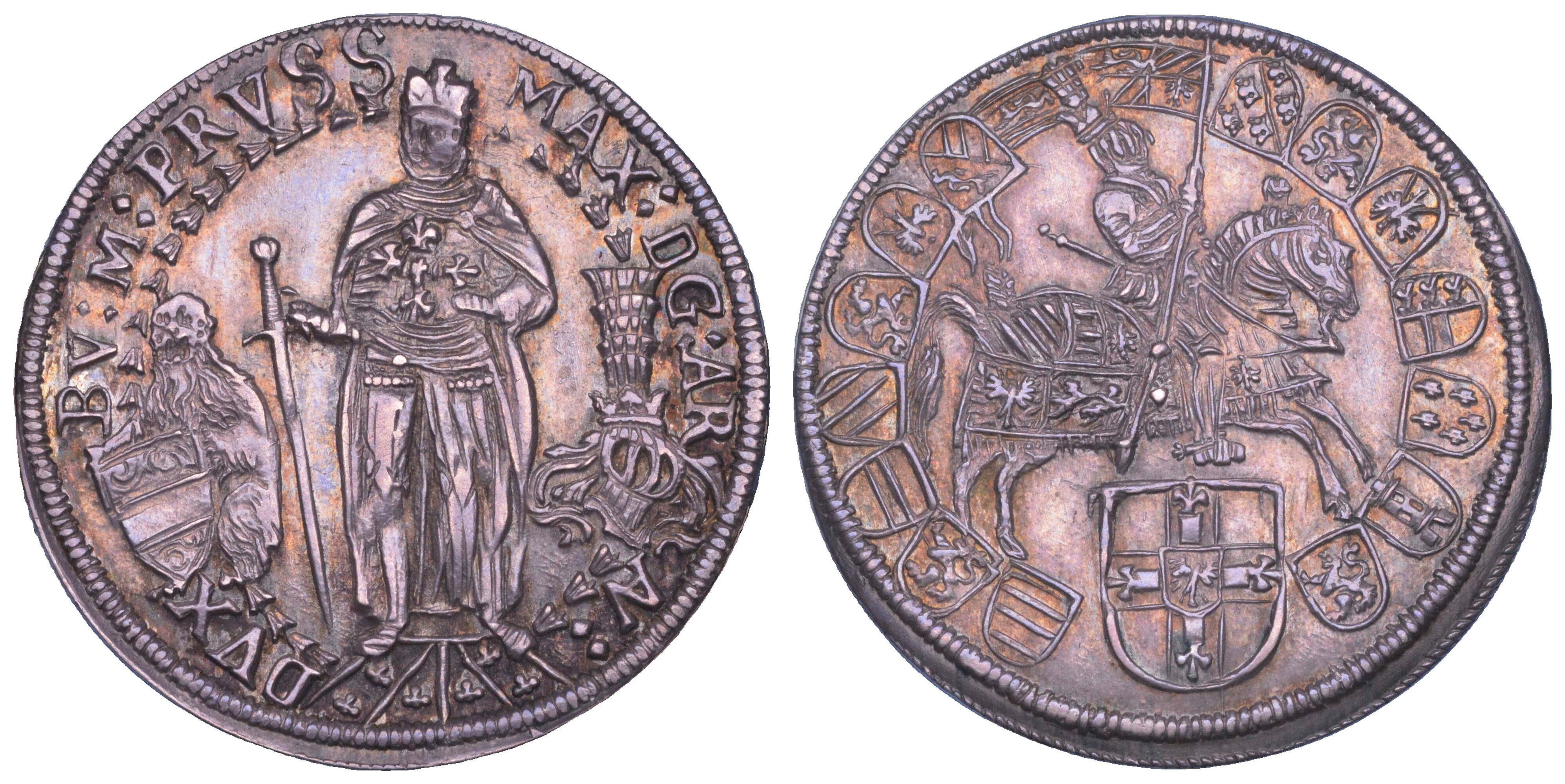 Massimiliano come Gran Maestro dell’Ordine Teutonico; ai lati, stemma ed elmo. R/ Cavaliere con stendardo al galoppo verso d. KM# 39. g. 7,24. Diam. mm. 30,68. Arg. Piacevole patina. q.SPL