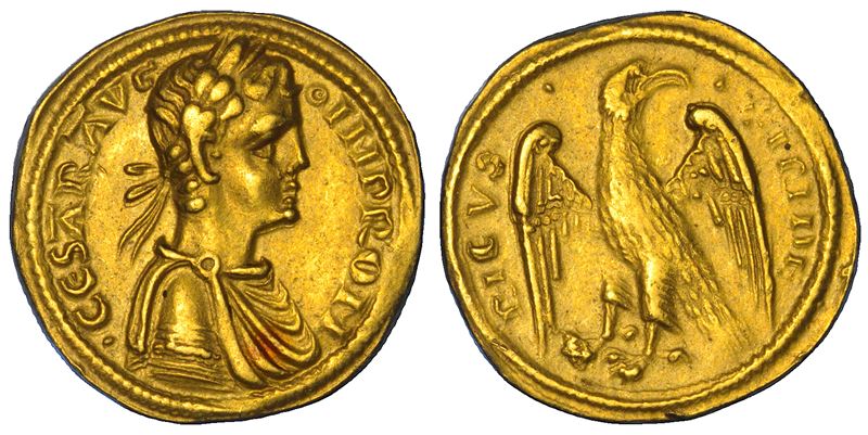 CESAR AVG – IMP ROM Busto drappeggiato e laureato a d. R/ FRIDE RICVS Aquila ad ali spiegate volta a s., retrospiciente. CNI 22. Kowalski SNR, 213 (F92/–). MEC 14. MIR 267. Rarissimo. g. 2,62. Diam. mm. 16,55. Oro. q.SPL