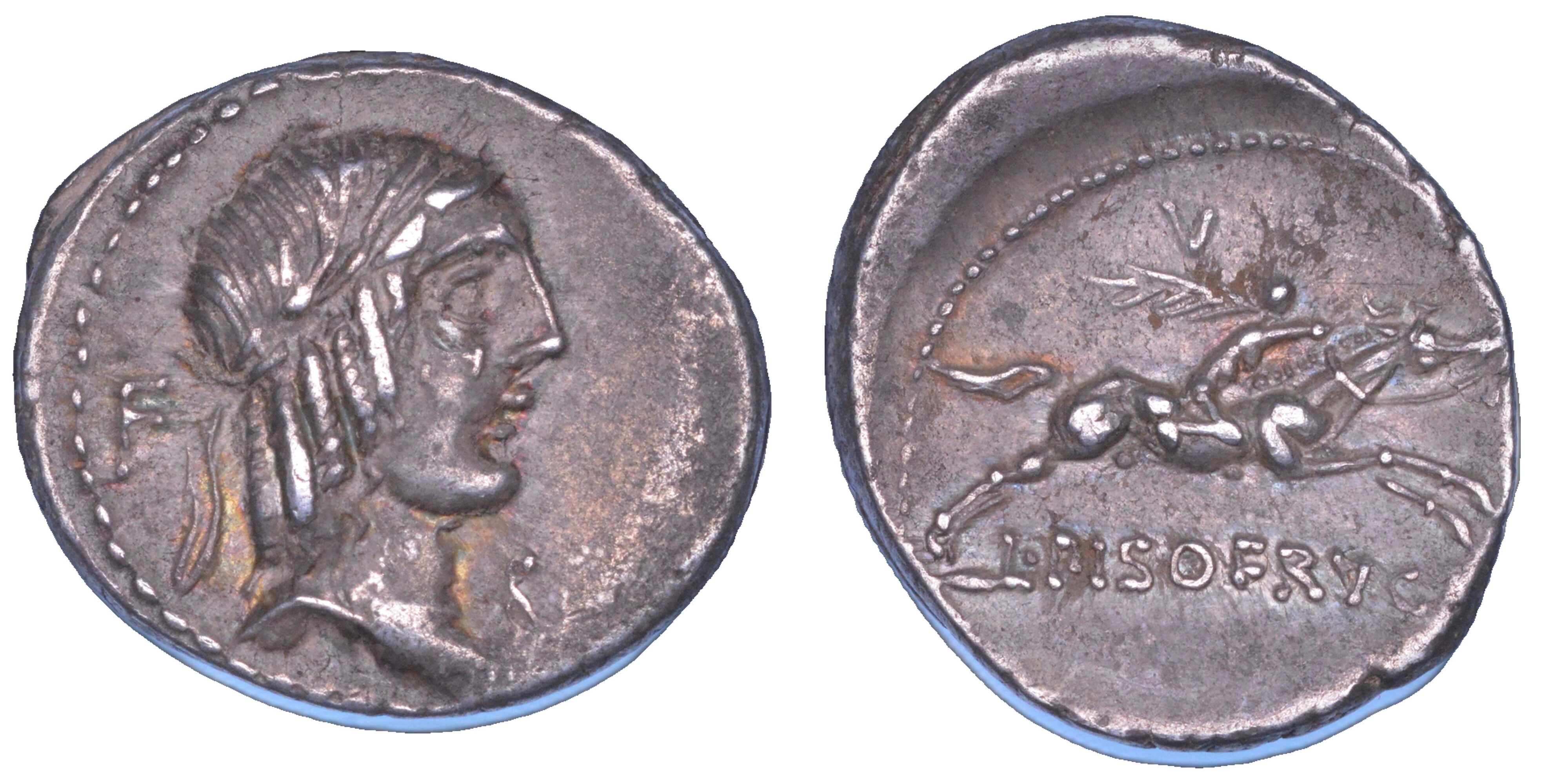 Testa laureata di Apollo a d.; lettera F, dietro la nuca. R/ Cavaliere al galoppo a d., con ramo di palma e redini; lettera V sopra. Crawford 340/1. Babelon (Calpurnia) 6-12. Sydenham 650-671. g. 3,99. Diam. mm. 17,12. Arg. q.SPL