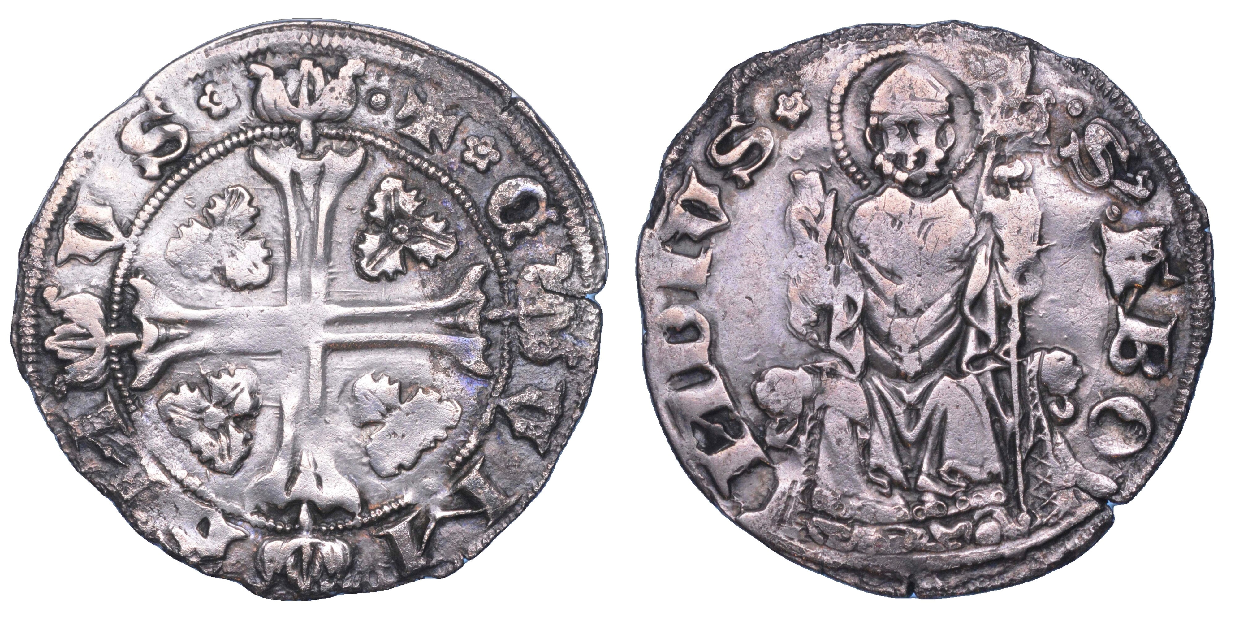 Croce gigliata con trifogli nei quarti. R/ Sant'Abbondio. seduto frontale e benedicente, regge pastorale. MIR 283. Molto raro. g. 2,41. Diam. mm. 25,10. Arg. Corrosioni. MB