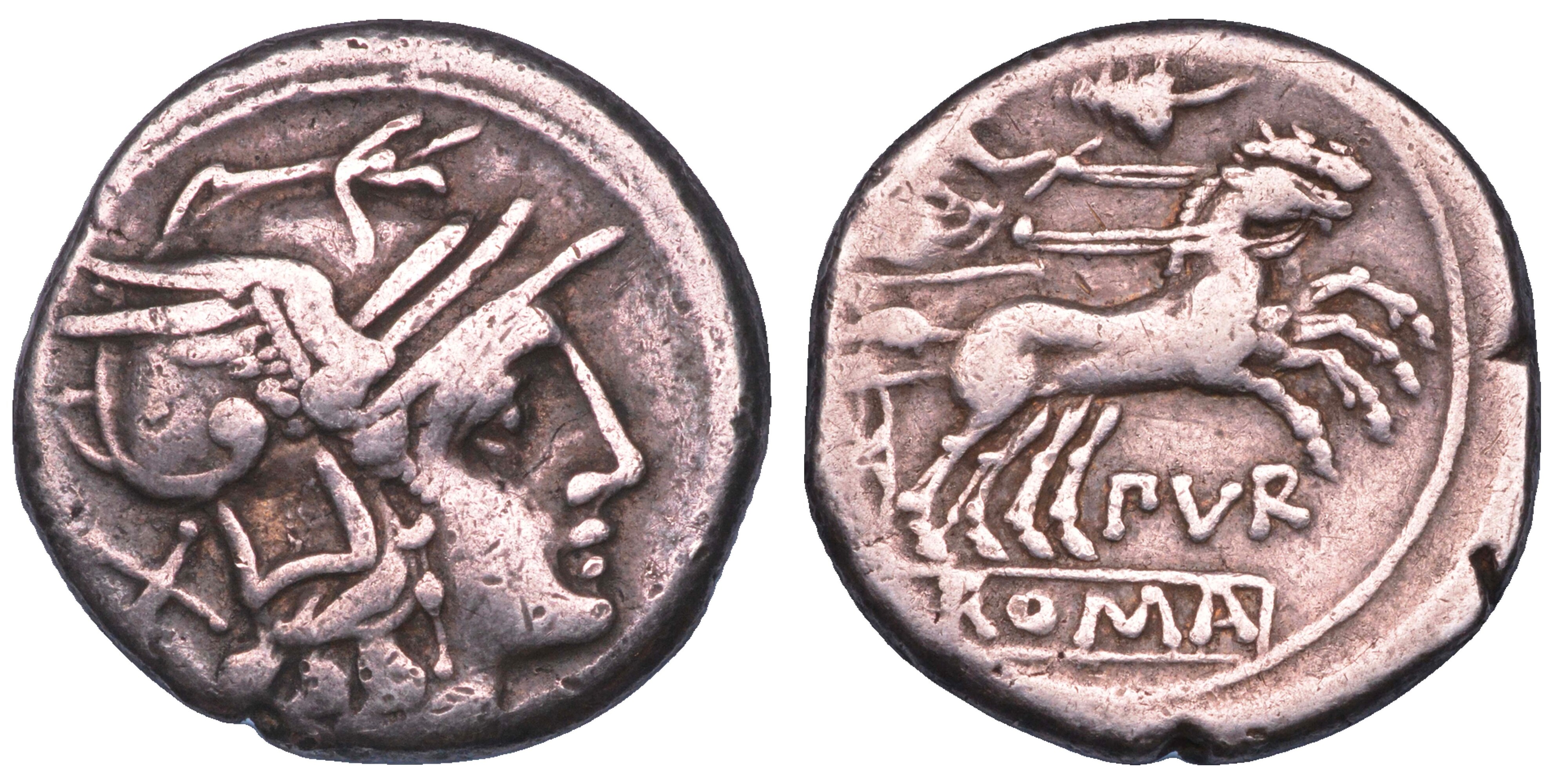 FURIA. Furius Porpureus , 169-158 a.C. Denario.