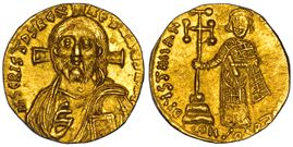 Busto nimbato del Cristo "Pantocrator" di fronte nell'atto di benedire. R/ Giustiniano II stante di fronte, tiene con la mano d. una croce potenziata. DOC. II-2/578/7. Ratto n. 1682. g. 4,16. Diam. mm. 18,73. Oro. q.SPL