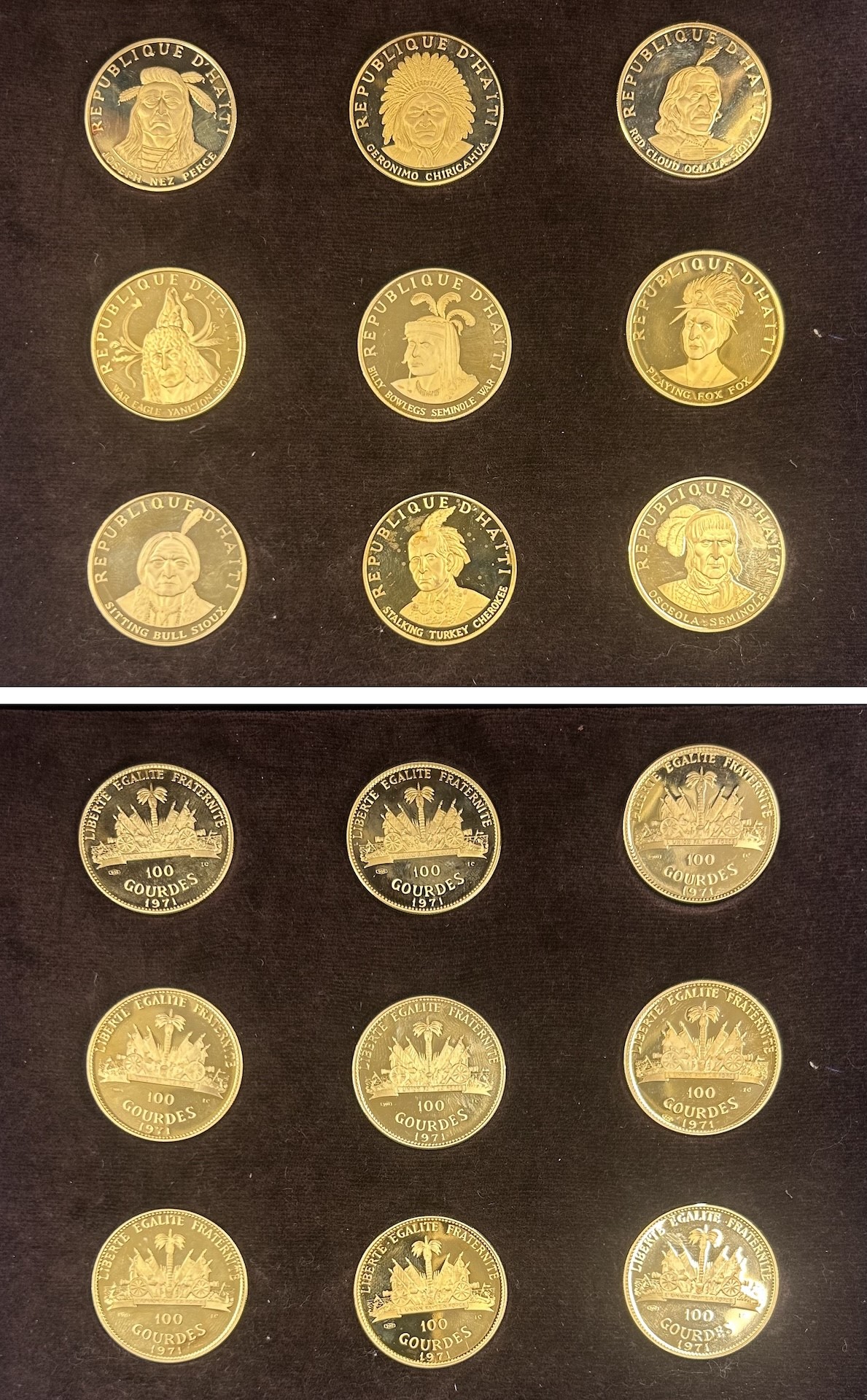 Serie composta da sei monete in oro commemorative da 100 Gourdes del 1971 dedicate agli indiani d'America. gr. 19,60. cad. titolo 0,900. KM. 90; 91; 92; 93; 94; 95; 96; 97; 98. Fondo specchio. In scatola originale.