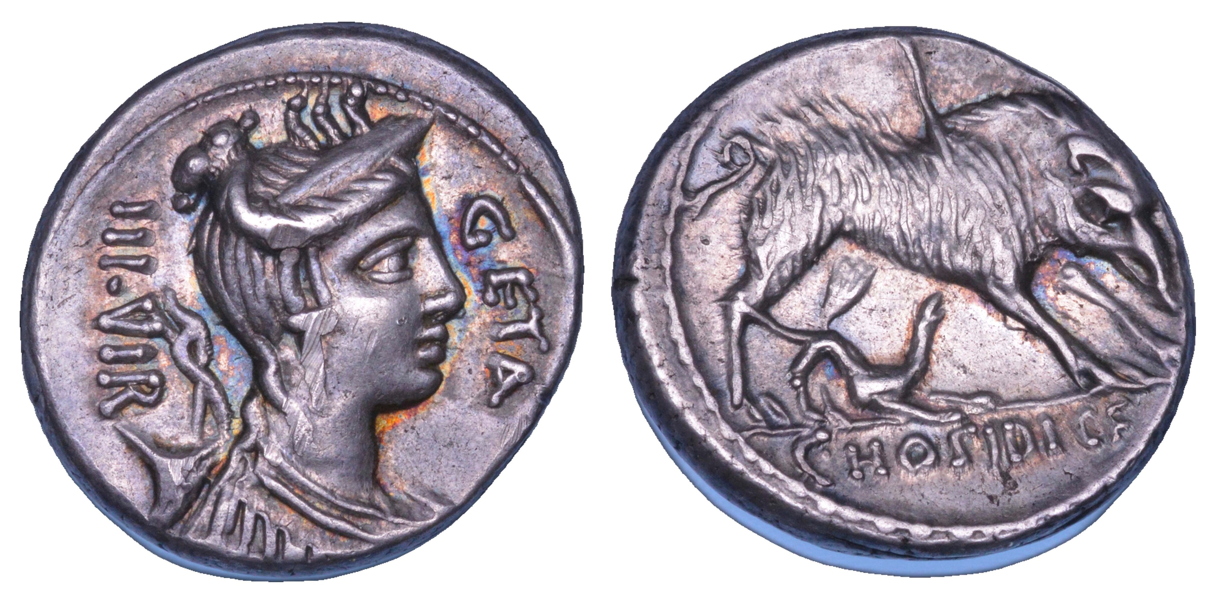 Testa diademata e drappeggiata di Diana a d. con arco e faretra. R/ Cinghiale calidonio colpito da lancia e aggredito da cane. Crawford 407/2. Sydenham 903. Hosidia 1. g. 4,03. Diam. mm. 16,24. Arg. q.SPL