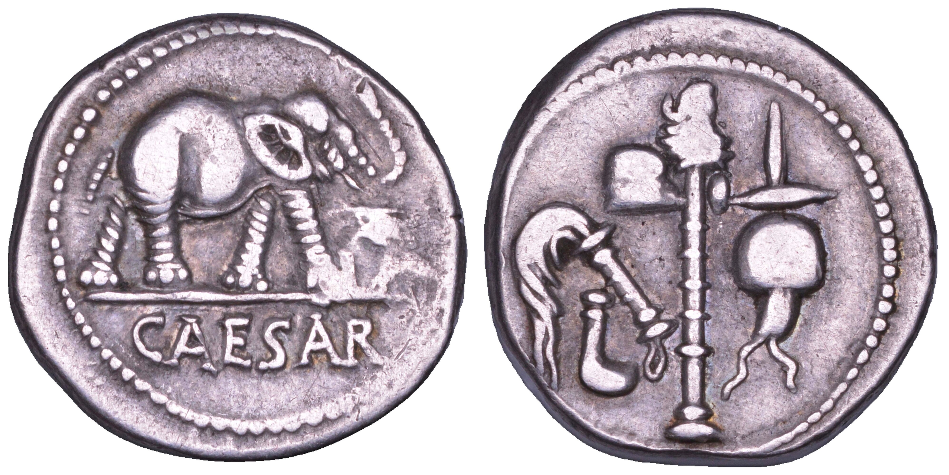 JULIA. C. Julius Caesar, 49-48 a.C. Denario, Zecca in movimento con Cesare.
