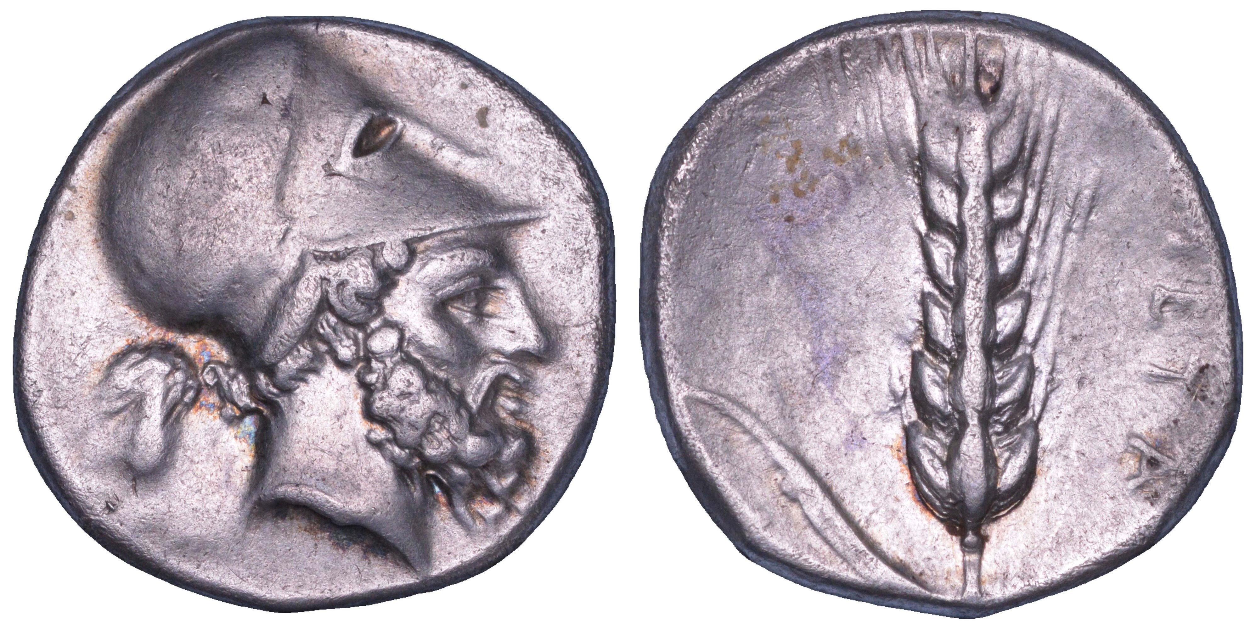 Testa elmata di Leucippo a d.; dietro, grappolo d'uva R/ META Spiga con foglia a s. HN III 1553. SNG Ashmolean 738. g. 7,65. Diam. mm. 20,98. Arg. Migliore di BB