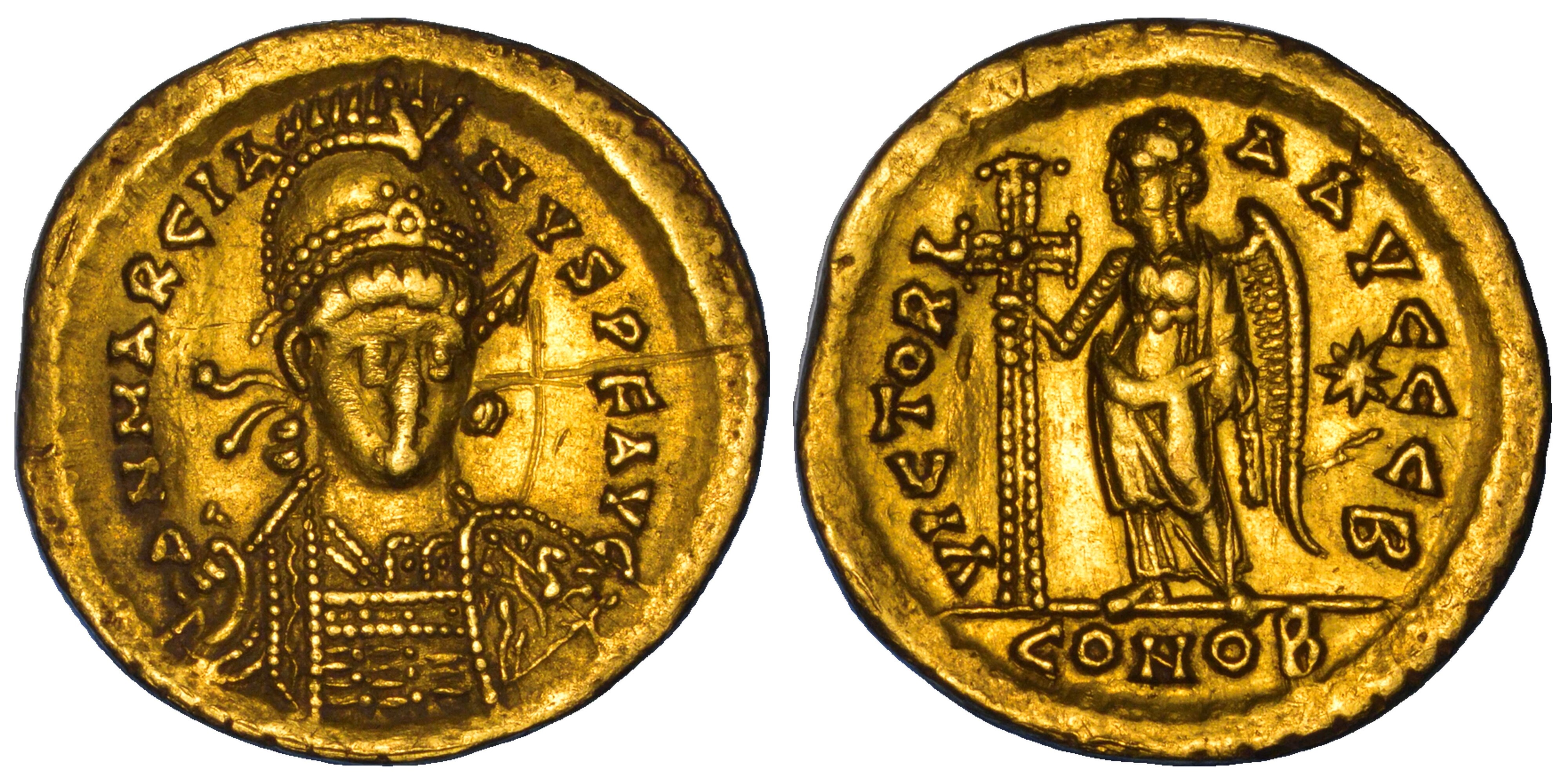 D N MARCIANVS P F AVG. Busto con diadema, elmo e corazza, rivolto leggermente a d., con lancia e scudo decorato con cavaliere. R/ VICTORIA AVGGG B / CONOB. Vittoria in piedi a s., con lunga croce gemmata; stella nel campo d. g. 4,43. Diam. mm. 19,83. Oro. Graffito al diritto. q.BB