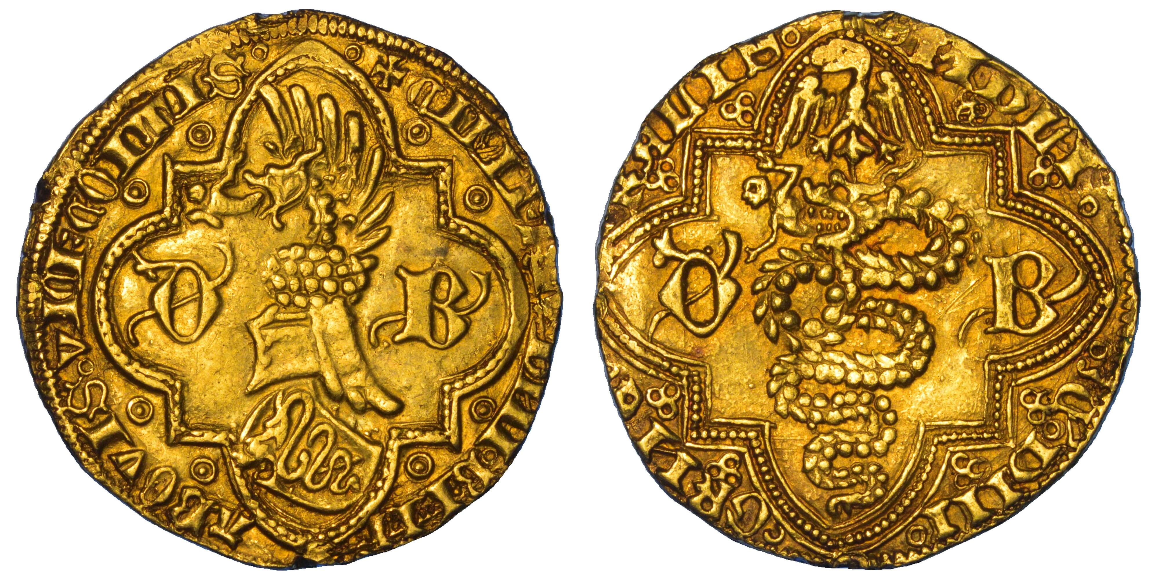 + CIMERIV DNI BEN ABOVIS VICECOMIS Scudetto con la biscia viscontea sormontato da elmo con cimiero ornato da drago piumato, con fanciullo nelle fauci; ai lati, le iniziali D – B (Dominus Bernabos). Il tutto entro cornice. R/ MDLI 3 C GENE RALIS Biscia viscontea sormontata da aquila imperiale; ai lati, le iniziali D B. Intorno, cornice ornata agli angoli da otto triplici anelli. Crippa 1. CNI 1/11. MEC 1, 623. MIR 110/2. Molto raro. g. 3,44. Diam. mm. 21,73. Oro. Tracce di montatura. ottimo BB
