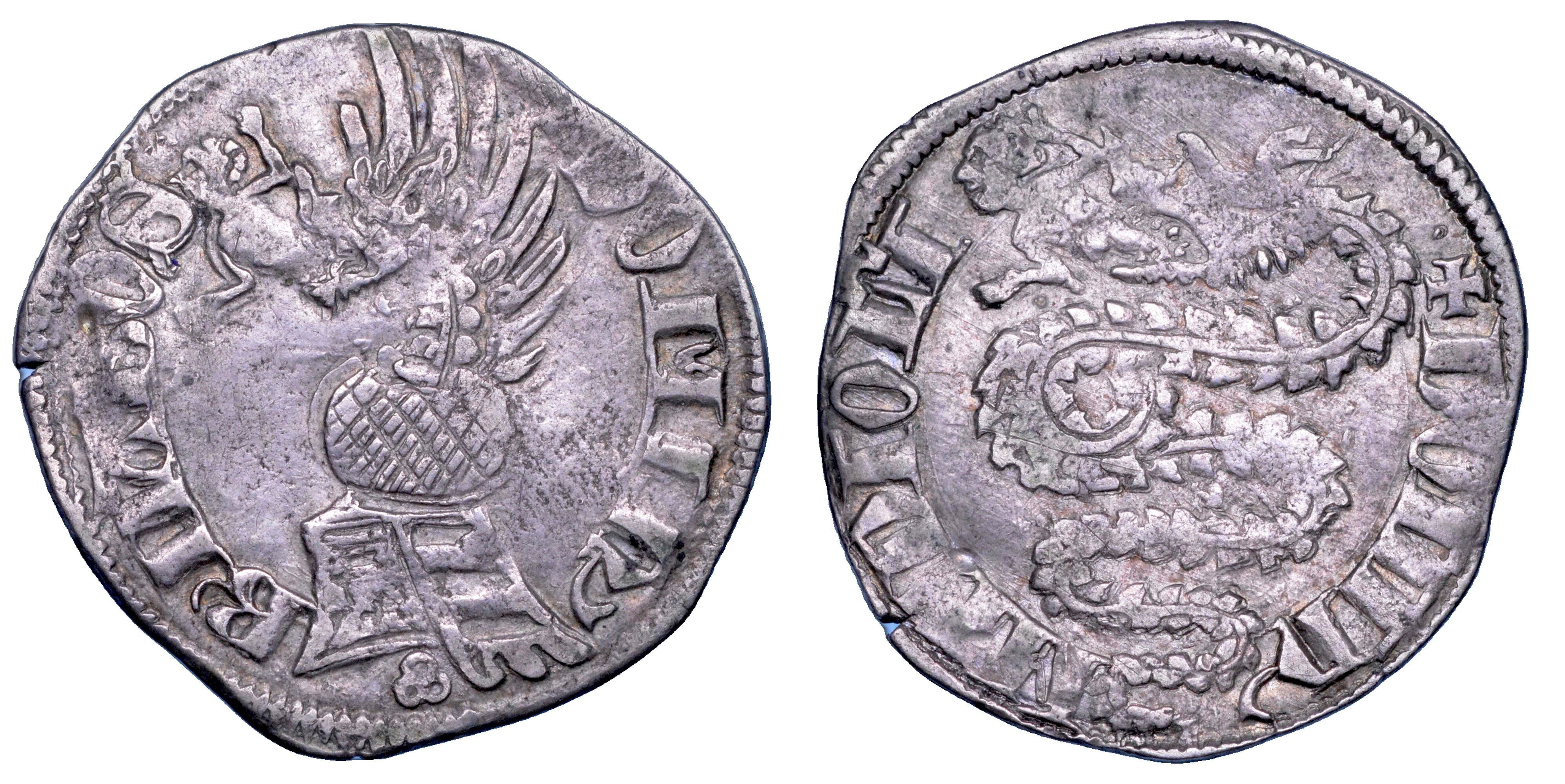 + DOMIN BNABOS Elmo con cimiero ornato da drago crestato con fanciullo nelle fauci. R/ + DOMIN MEDIOLI Biscia viscontea con fanciullo nelle fauci. Crippa 2/A. MIR. 111/1. g. 2,48. Diam. mm. 25,20. Arg. BB