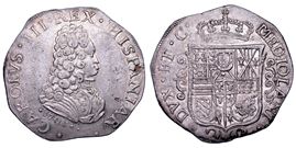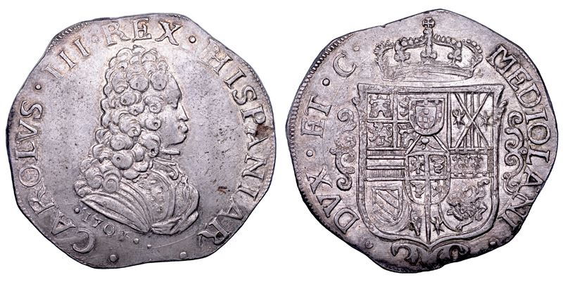 Busto a d. con fluente parrucca e corazza; sotto la spalla, 1707. R/ MEDIOLANI DVX ET C Stemma reale di Spagna coronato e caricato al centro da scudetto con le armi di Milano. Crippa 1. MIR 398/1. Raro. g. 27,73. Diam. mm. 40,28. Arg. SPL