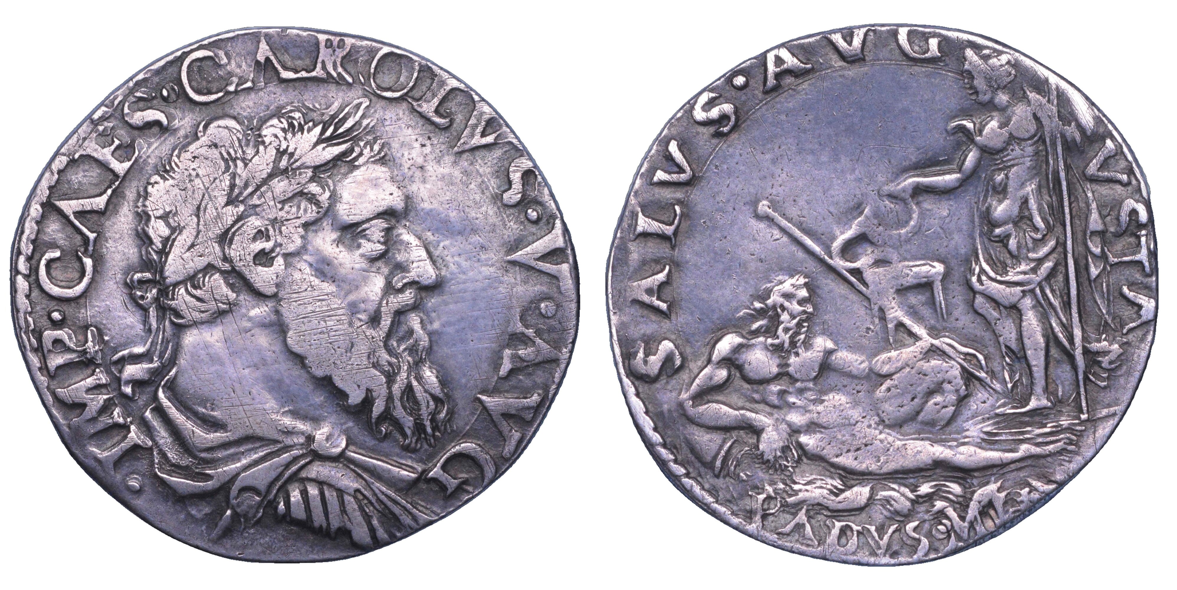 IMP CAES CAROLVS V AVG Busto a d. laureato, paludato e con corazza all'antica. R/ SALVS AVG VSTA La Salute stante tiene con la mano s. un'asta e con la d. una patera, con la quale nutre un serpente che esce da un altare. A s., coricato, il fiume Po, con un'anfora da cui sgorga dell'acqua. In esergo, PADVS MLI. Crippa 12. MIR 285. Raro. g. 7,23. Diam. mm. 26,68. Arg. Lieve tosatura e leggeri graffi. BB