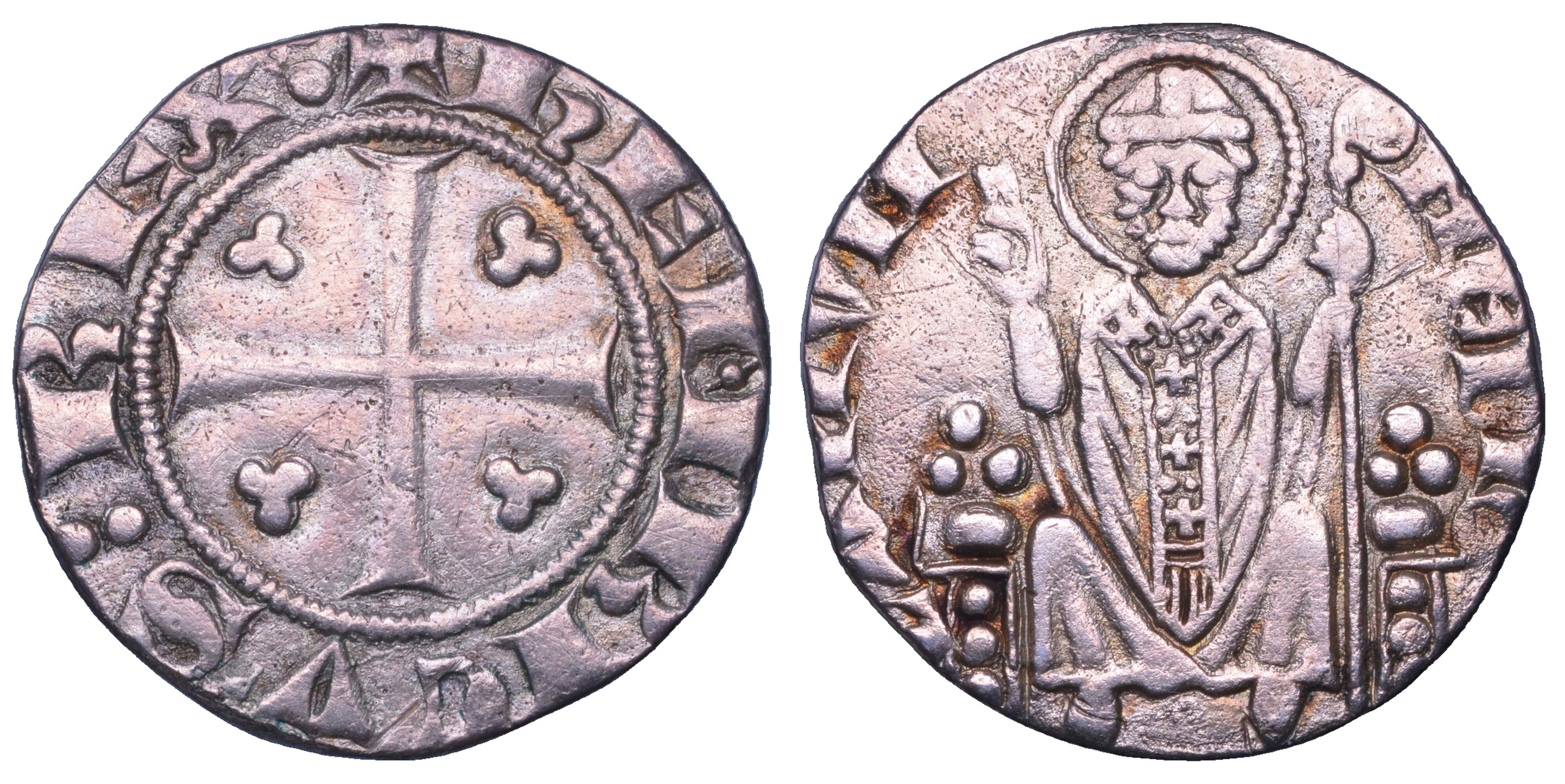Croce accantonata da quattro trifogli. R/ Sant'Ambrogio, mitrato e nimbato, seduto in cattedra di prospetto, stringe nella s. il pastorale e alza la mano destra in atto di benedire. Crippa 1/A. g. 3,19. Diam. mm. 22,52. Arg. Lieve tosatura. q.BB