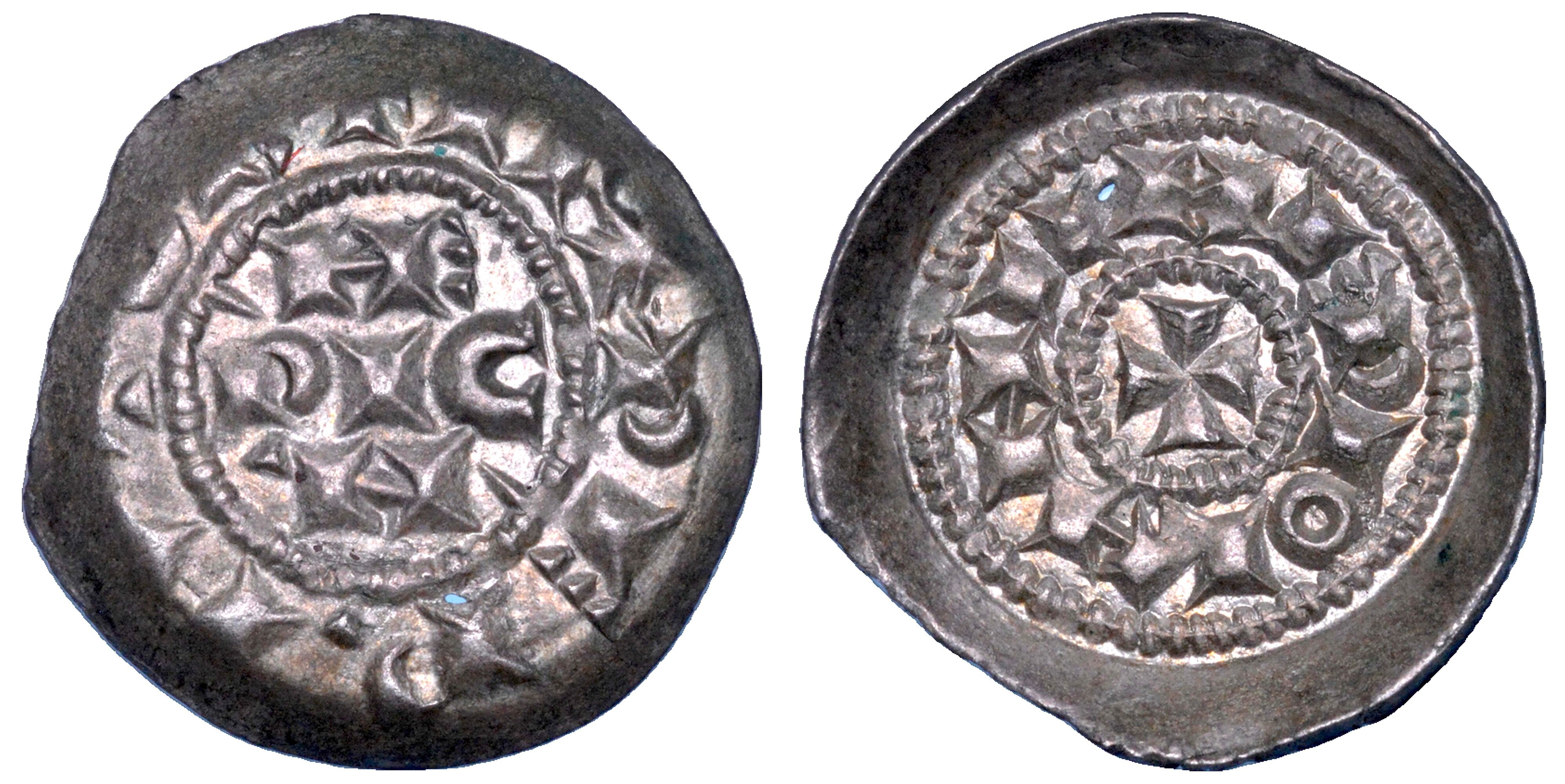 + IMPERATOR Nel campo, HE RIC N. Iscrizione disposta su tre righe. R/ MEDIOLANV Croce patente. Crippa 2/D (varietà con due cunei al diritto, ad ore 4 e 10). MIR 52/1. g. 0,65. Diam. mm. 16,91. Arg. SPL