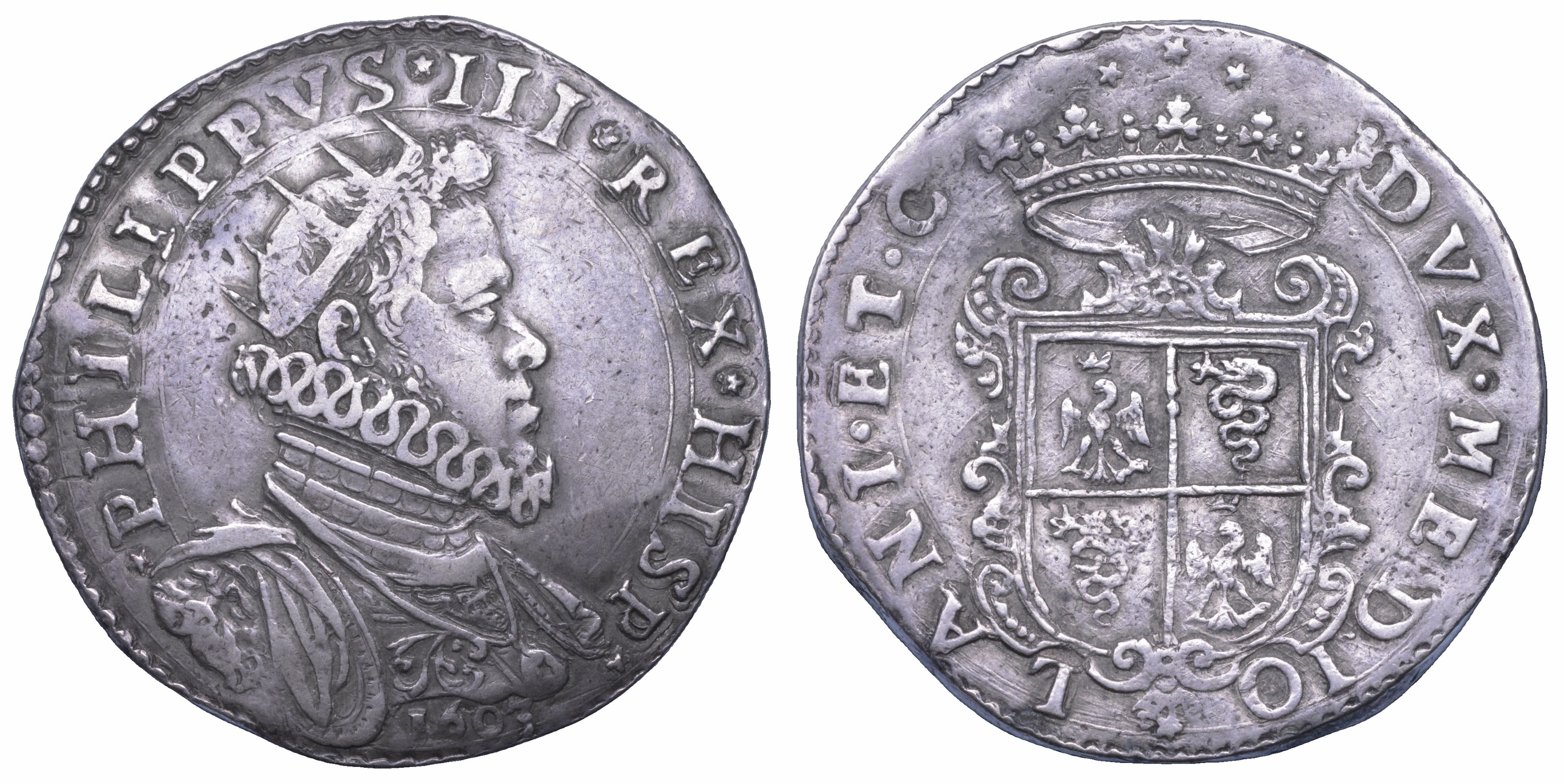 PHILIPPVS III REX HISP Busto a d. corazzato con testa radiata; goletta con colletto pieghettato e sul petto il Collare del Toson d’oro. Sotto il busto, 1603. R/ DVX MEDIO LA NI ET C Stemma coronato inquartato con l’aquila e la biscia e sormontato da corona. Sopra la corona tre stelle; sotto una stella. Crippa, 4/A-B. MIR. 340/3-4 Estremamente rara. g. 31,74. Diam. mm. 40,70. Arg. BB