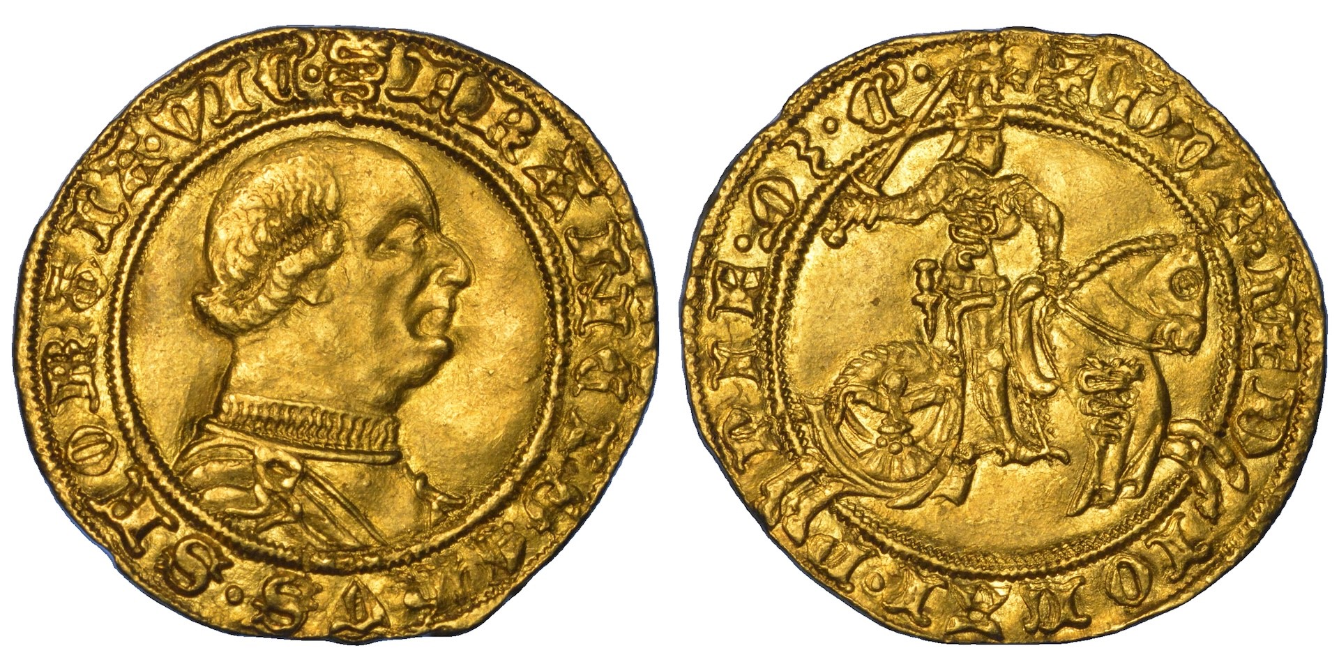 FRANCISCHVS SFORTIA VIC/ Busto di Francesco I corazzato a d. R/ DVX MEDIOLAI P PIE Q 3 C/ Il duca in armatura a cavallo al galoppo a d. La corazza è ornata da una biscia e la gualdrappa da una scopetta e da una biscia. Crippa 3/A. MIR 171/2. Raro. g. 3,53. Diam. mm. 23,11. Oro. SPL.
