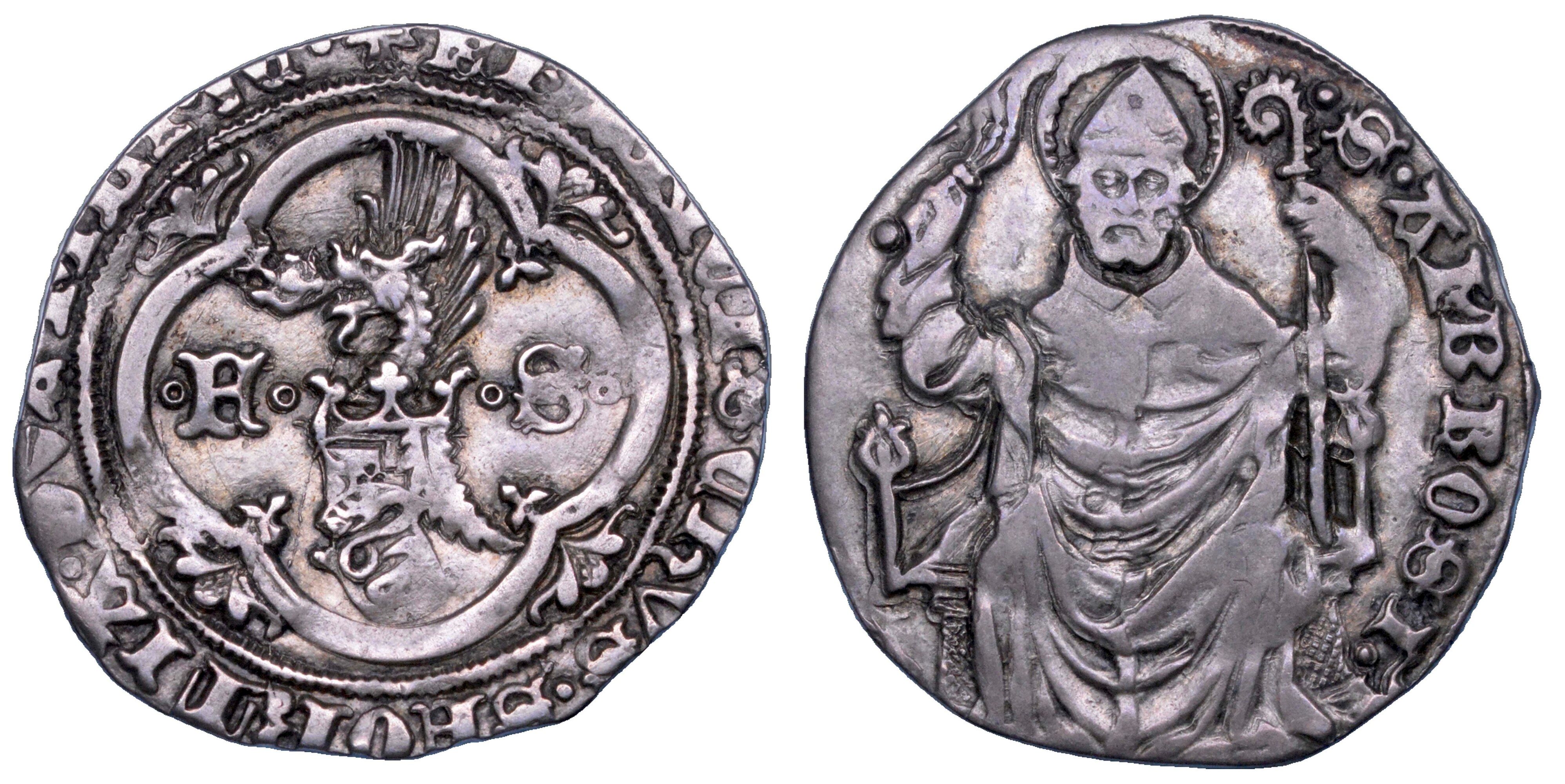+ FRANCISCHVS SFORTIA DVX MLI 3 C. Nel campo, entro cornice quadrilobata ornata di fiori, scudetto con la biscia, sormontato da elmo coronato e cimiero orinato da drago piumato con fanciullo tra le fauci. Ai lati le iniziali F - S. R/ S AMBROSI MEDIOLANI Sant'Ambrogio, mitrato con il nimbo perlato, in cattedra, seduto di prospetto, tiene staffile e pastorale. Crippa 7. MEC 701. MIR 174/1. Molto rara. g. 2,44. Diam. mm. 22,17. Arg. Lieve tosatura. MB/BB