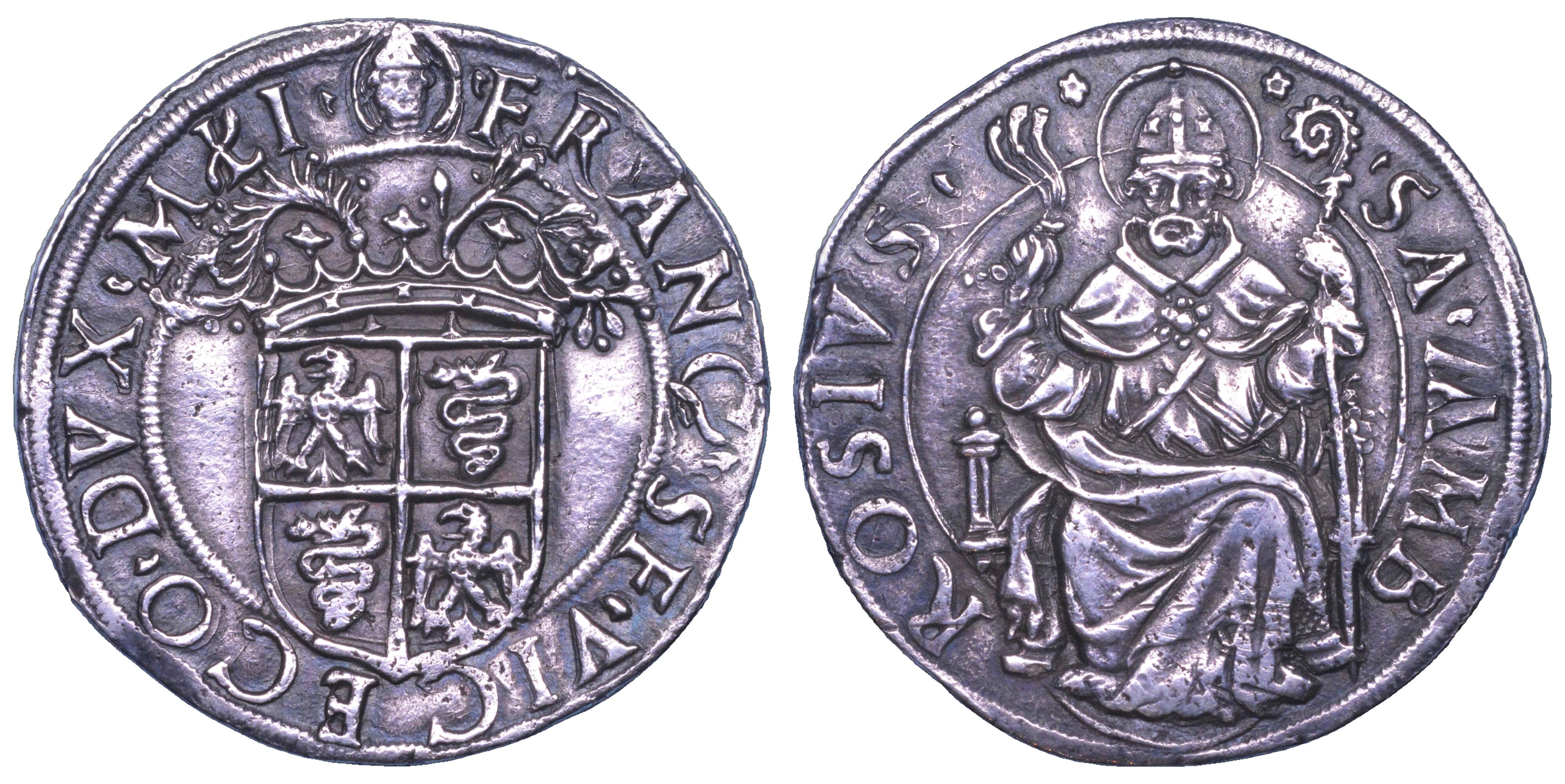 FRANC SF VICECO DVX ML/I Stemma inquartato con l’aquila e la biscia, sormontato dalla corona da cui escono rami di palma e di olivo. R/ S AMB ROSIVS Sant’Ambrogio, mitrato e nimbato, in cattedra, seduto di prospetto, stringe nelle mani staffile e pastorale. Crippa 3. MIR 268. Molto Rara. g. 9,53. Diam. mm. 28,21. Arg. q.SPL