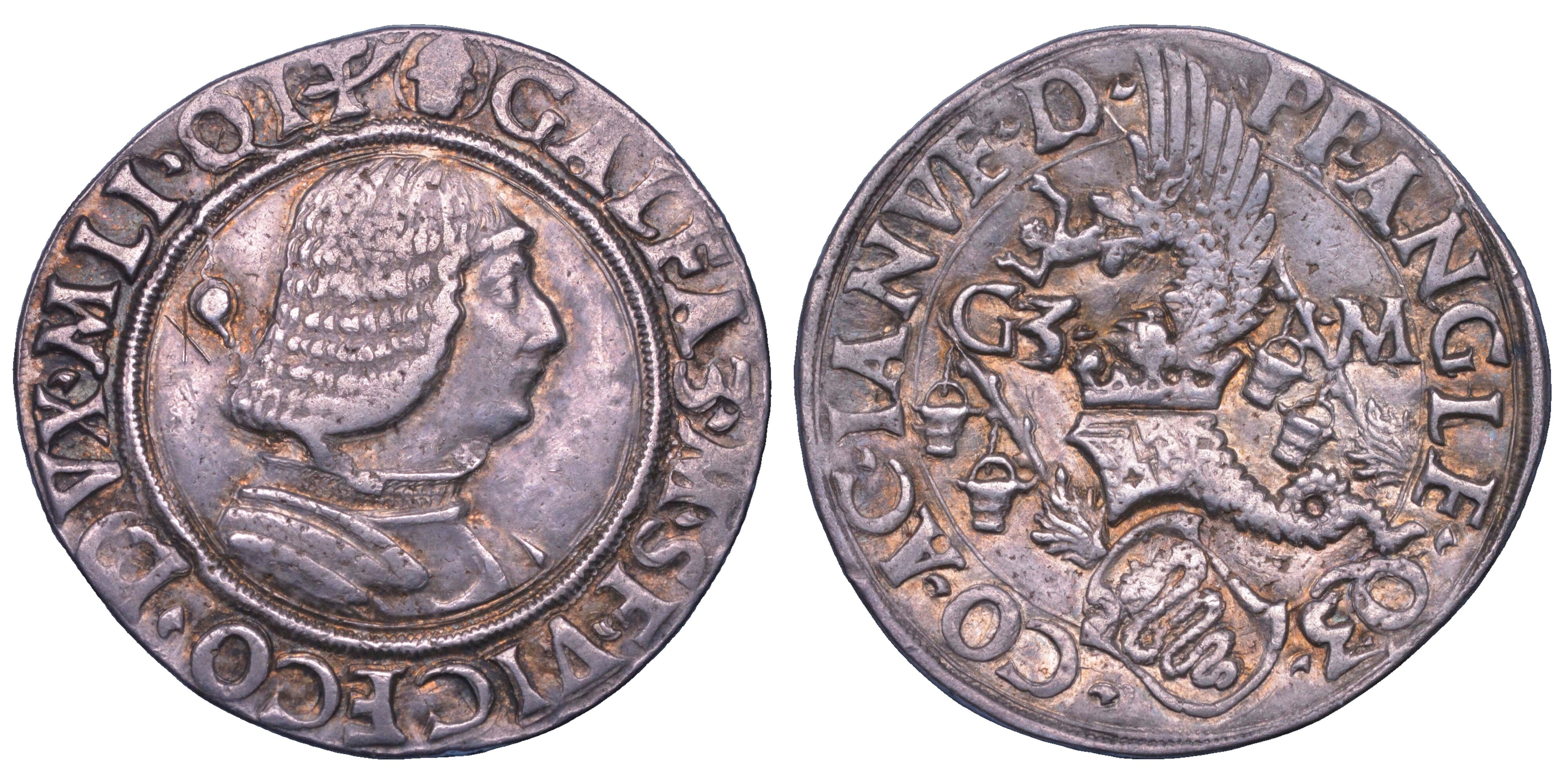 Busto a d. corazzato e a testa nuda; dietro la testa, borchia. R/ Scudetto con la biscia, non coronata, sormontato da elmo coronato e cimiero ornato da drago crestato. Ai lati, tizzoni ardenti con le secchie e le iniziali G3 - M. Crippa 6/A. CNI 52. RMM 8. MIR 201/2. g. 9,61. Diam. mm. 28,41. Arg. Lievi difetti di conio. Piccolo graffito dietro la borchia al diritto. BB