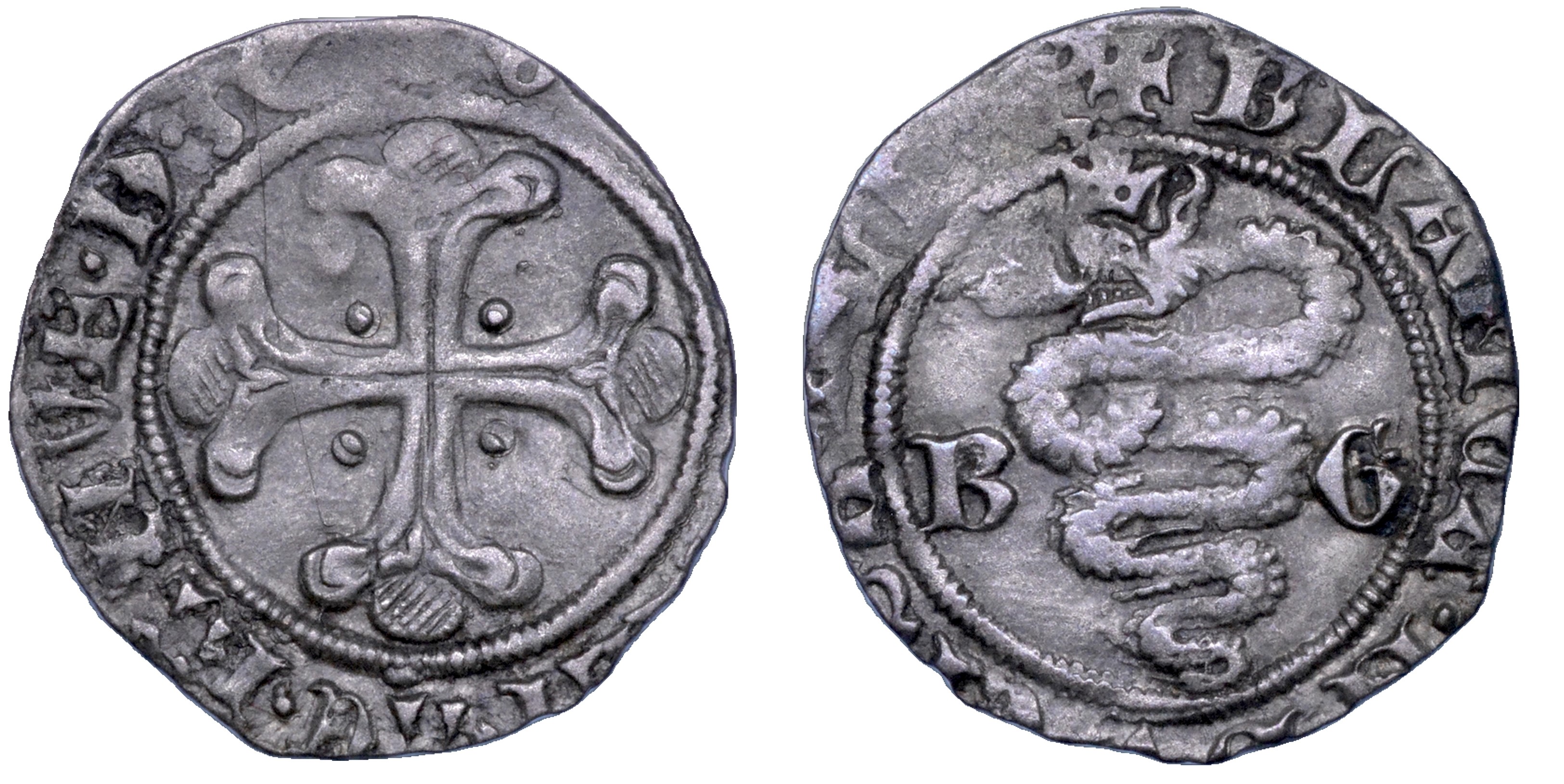+ G3 M DVX MLI AC IANVE D 3 C Croce fiorata, accantonata da quattro globetti. R/ + BLANCA M DUCISA MLI 3 C Biscia coronata tra le iniziali B - G (Bianca - Galeazzo). Crippa 3. MEC 718. MIR 196/1. g. 0,81. Diam. mm. 16,81. Mist. q.BB