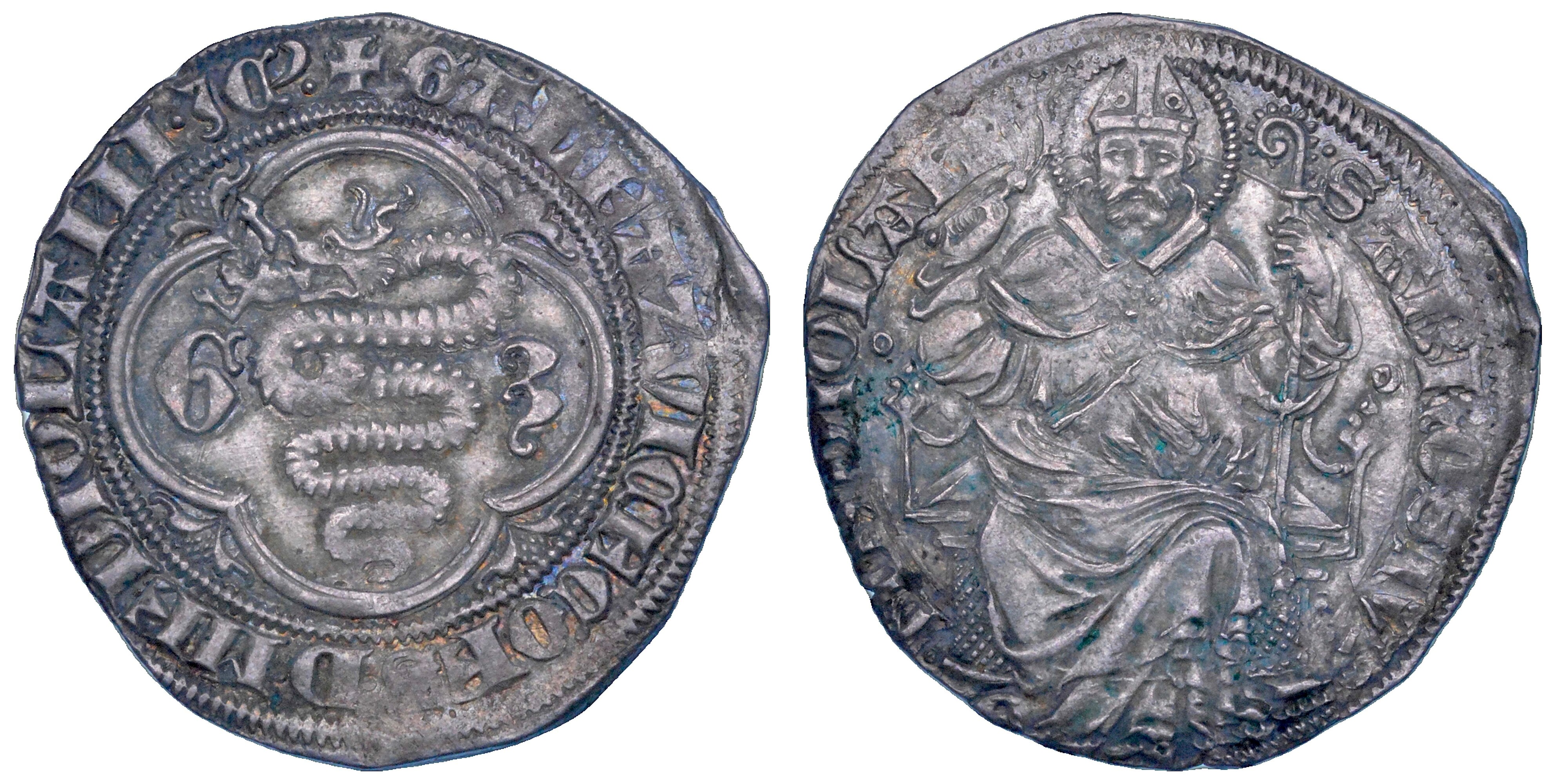 + GALEAZ VICECOES D MEDIOLANI 3 C Biscia viscontea affiancata dalle iniziali G – 3, entro cornice ornata da piccoli gigli. Nessun segno sopra la biscia. R/ S AMBROSIV MEDIOLAN Sant’Ambrogio, mitrato, nimbato, in cattedra, seduto di prospetto e con staffile e pastorale nelle mani; ai lati, due piccoli anelli. Crippa 4/A. g. 2,43. Diam. mm. 25,16. Arg. Esemplare ben coniato q.BB