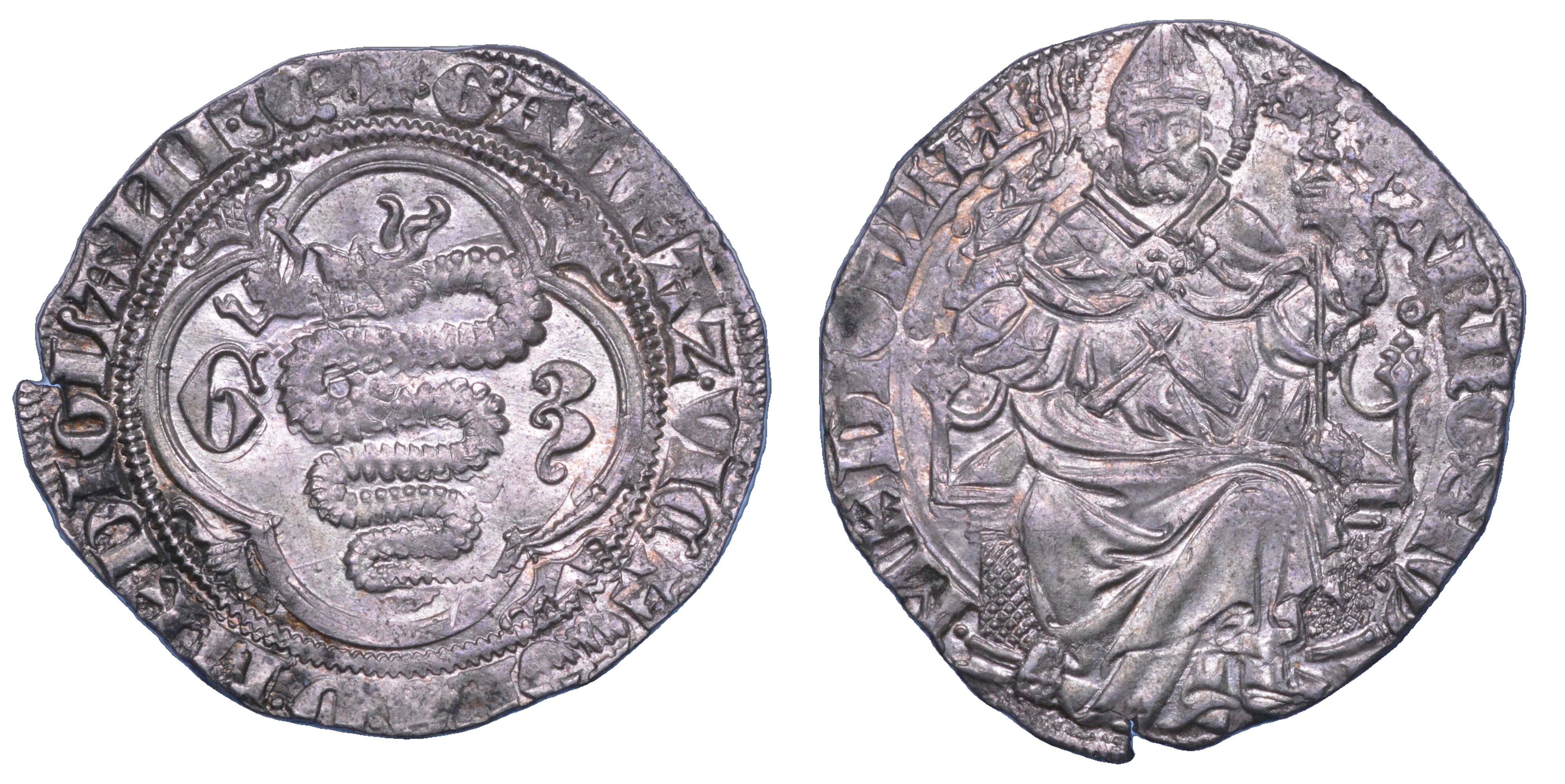 + GALEAZ VICECOES D MEDIOLANI 3 C Biscia viscontea affiancata dalle iniziali G – 3, entro cornice ornata da piccoli gigli. Nessun segno sopra la biscia. R/ S AMBROSIV MEDIOLAN Sant’Ambrogio, mitrato, nimbato, in cattedra, seduto di prospetto e con staffile e pastorale nelle mani; ai lati, due piccoli anelli. Crippa 4/A. MEC 635. MIR 121/1. g. 2,32. Diam. mm. 23,17. Arg. SPL Cartellino Crippa Numismatica