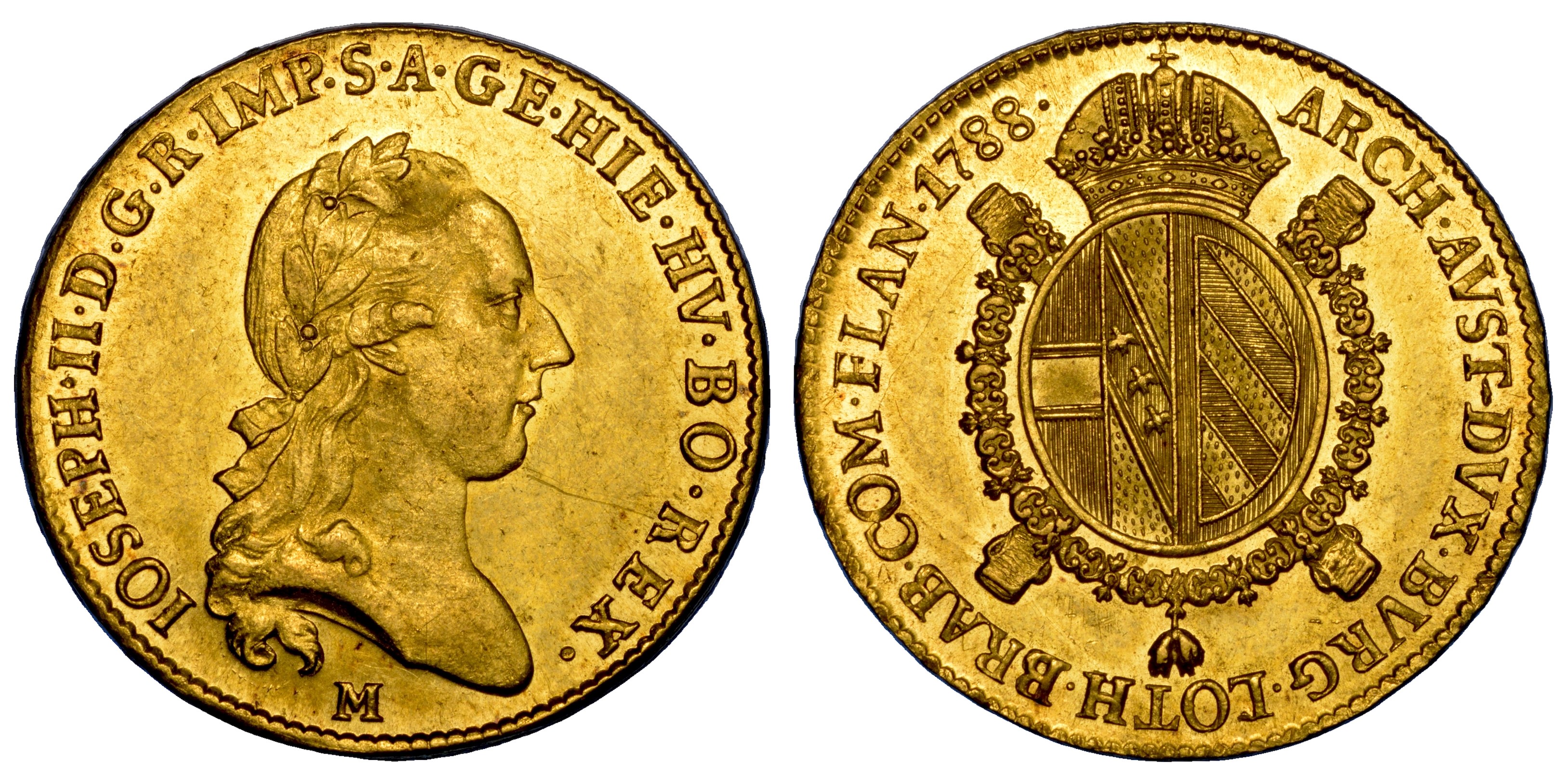 IOSEPH II D G R IMP S A GE HIE HV BO REX Testa laureata a d.; sotto, lettera M. R/ ARCH AVST DVX BVRG LOTH BRAB COM FLAN 1788 Stemma coronato e circondato dal Collare del Toson d'Oro. Crippa 13/D. MIR 455/4. Friedb. 739a. g. 11,07. Diam. mm. 27,71. Oro. Graffi al diritto. q.FDC