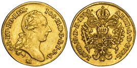 IOS II D G R I S A GE HV BO REX Testa a d. laureata; sotto, lettera M. R/ ARCH A D BVRG LOTH M D H 1786 Aquila bicipite sormontata da corona, caricata dello stemma austriaco coronato e circondato dal Collare del Toson d'Oro. Crippa 16/A. MIR 458/1. Molto raro. g. 3,44. Diam. mm. 21,10. Oro. q.BB