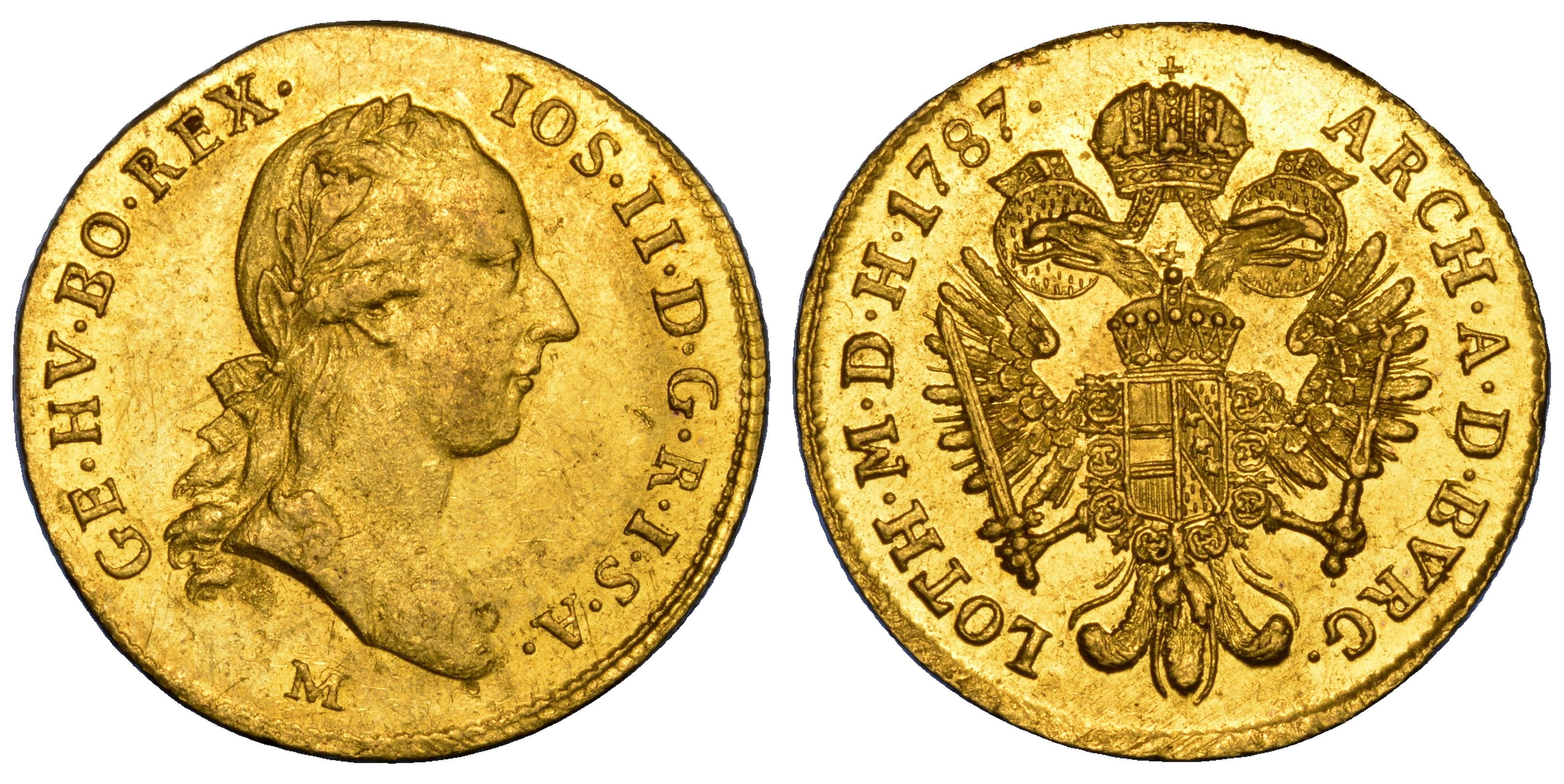 IOS II D G R I S A GE HV BO REX Testa a d. laureata; sotto, lettera M. R/ ARCH A D BVRG LOTH M D H 1787 Aquila bicipite sormontata da corona, caricata dello stemma austriaco coronato e circondato dal Collare del Toson d'Oro. Crippa 16/B. MIR 458/2. Raro g. 3,47. Diam. mm. 20,94 Oro. q.SPL