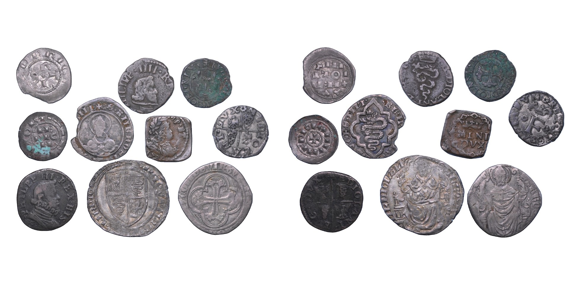Monetazione mista coniata dall’XI al XVIII durante i regni di Enrico III-V, Federico di Svevia, Gian Galeazzo Visconti, Filippo Maria Visconti, Galeazzo Maria Sforza, Ludovico XII d’Orleans, Filippo II d’Asburgo, Filippo III di Spagna, Filippo IV di Spagna, Carlo VI d’Asburgo. Esemplari in argento e rame. conservazioni da B/MB a BB.