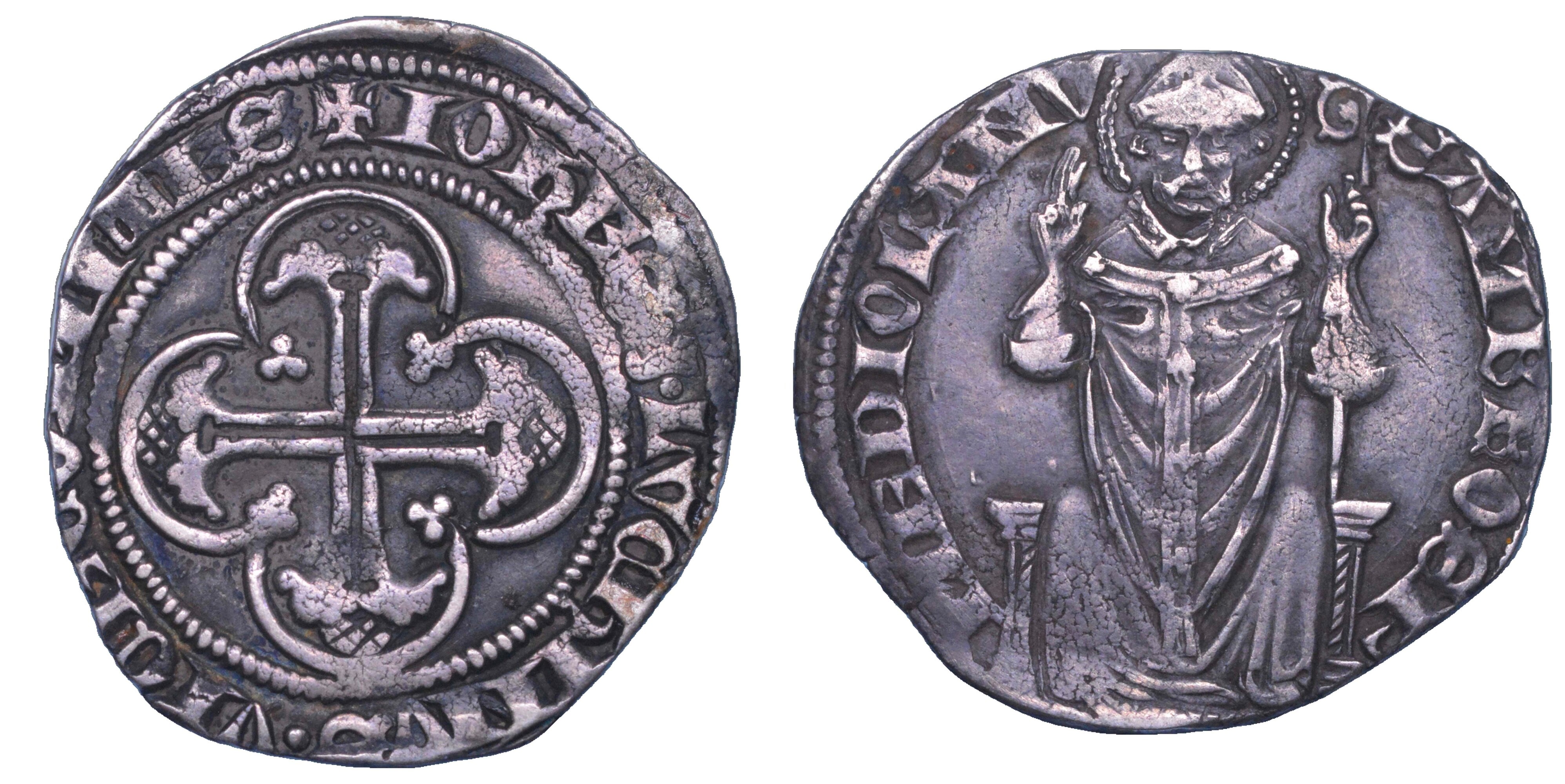 + IOHES 3 LVCHINVS VICECOMITES Croce gigliata entro cornice quadrilobata ornata agli angoli da trifogli. R/ S. Ambrogio seduto con pastorale, benedicente. Crippa 3/A. MEC 601. MIR 94/1. g. 2,85. Diam. mm. 24,37. Arg. BB