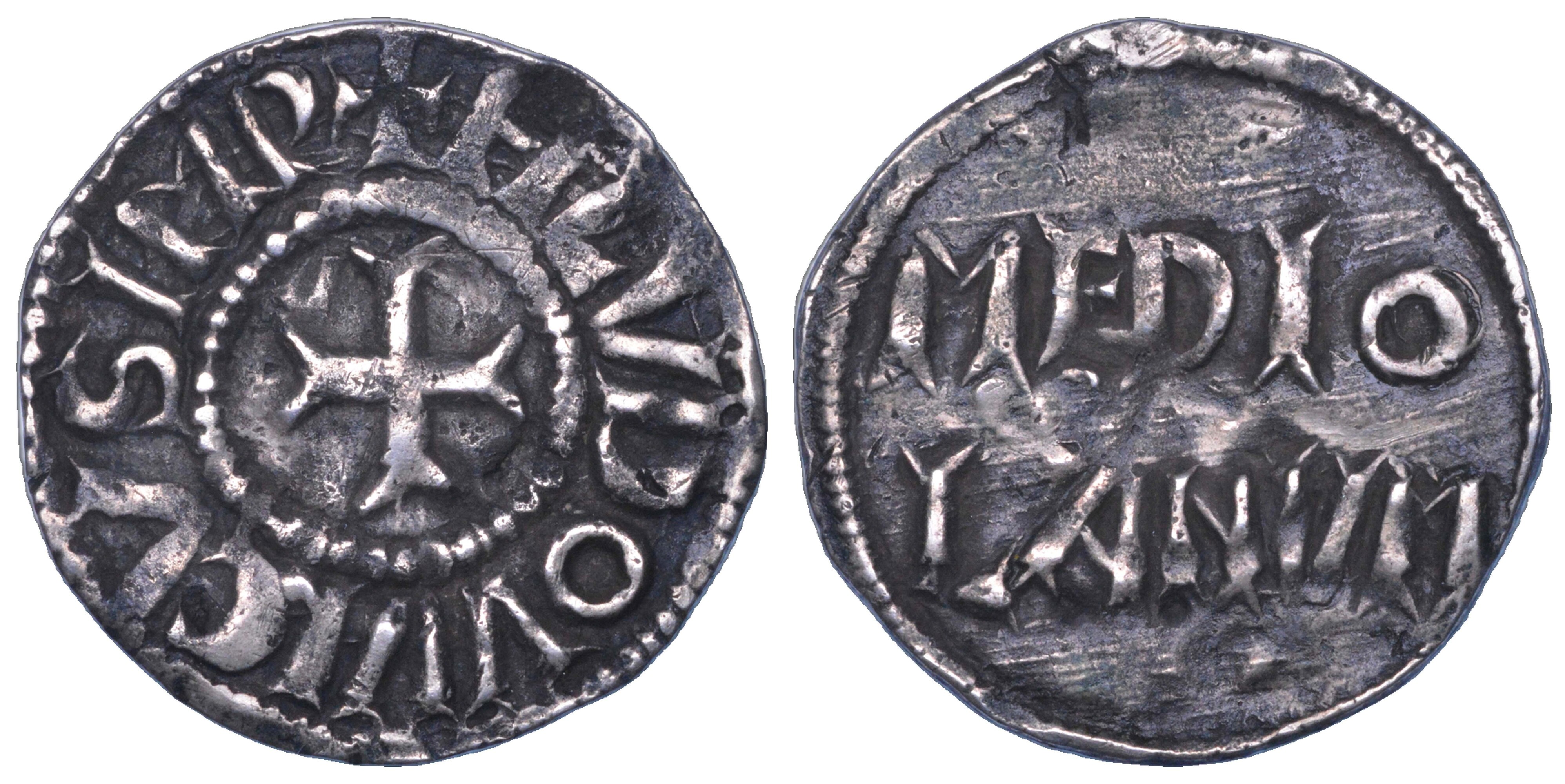 H LVDOVVICVS IMP Croce con estremità a coda di rondine entro cerchio. R/ MEDIO LANVM Scritto nel campo in due righe. Crippa 2. CNI 12 var. Morrison-Grunthal cf. 451. MEC, 787. MIR 6/1. g. 1,37. Diam. mm. 19,45. Arg. MB/q.BB