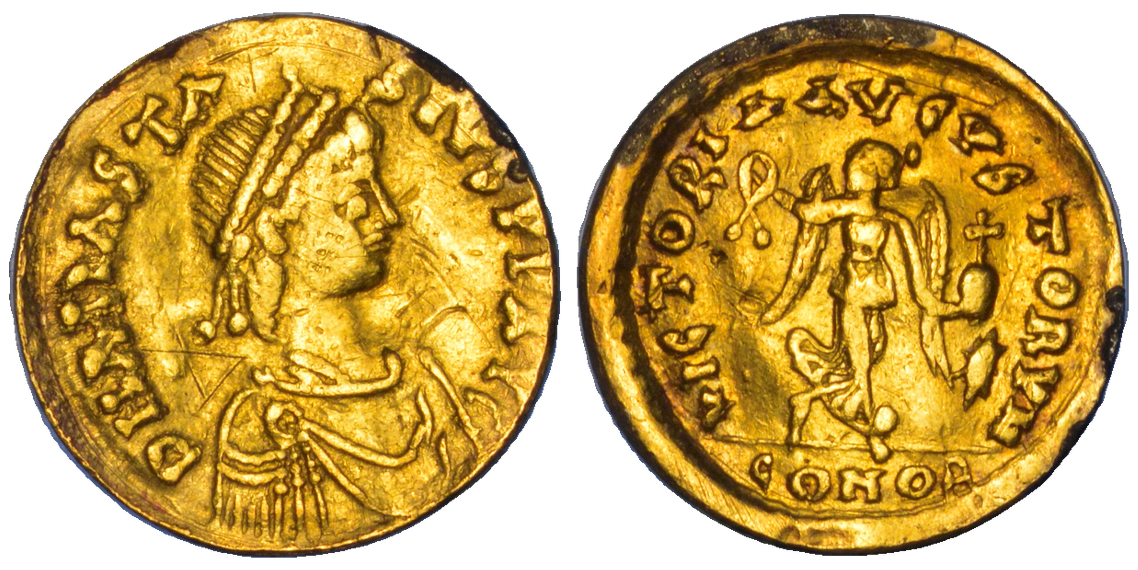 DN ANASTA SIVS PF AVG Busto drappeggiato a d. con diadema di perle. R/ VICTORIA AVGVSTORVM Vittoria che cammina a d. con corona e globo cruciforme, stella nel campo a d. In esergo, COMOB. Grierson/Blackburn 114; Hahn, MIB 10; Kraus, cf. 19; Metlich 14. g. 1,23. Diam. mm. 13,74. Oro. Concrezioni e graffi. MB