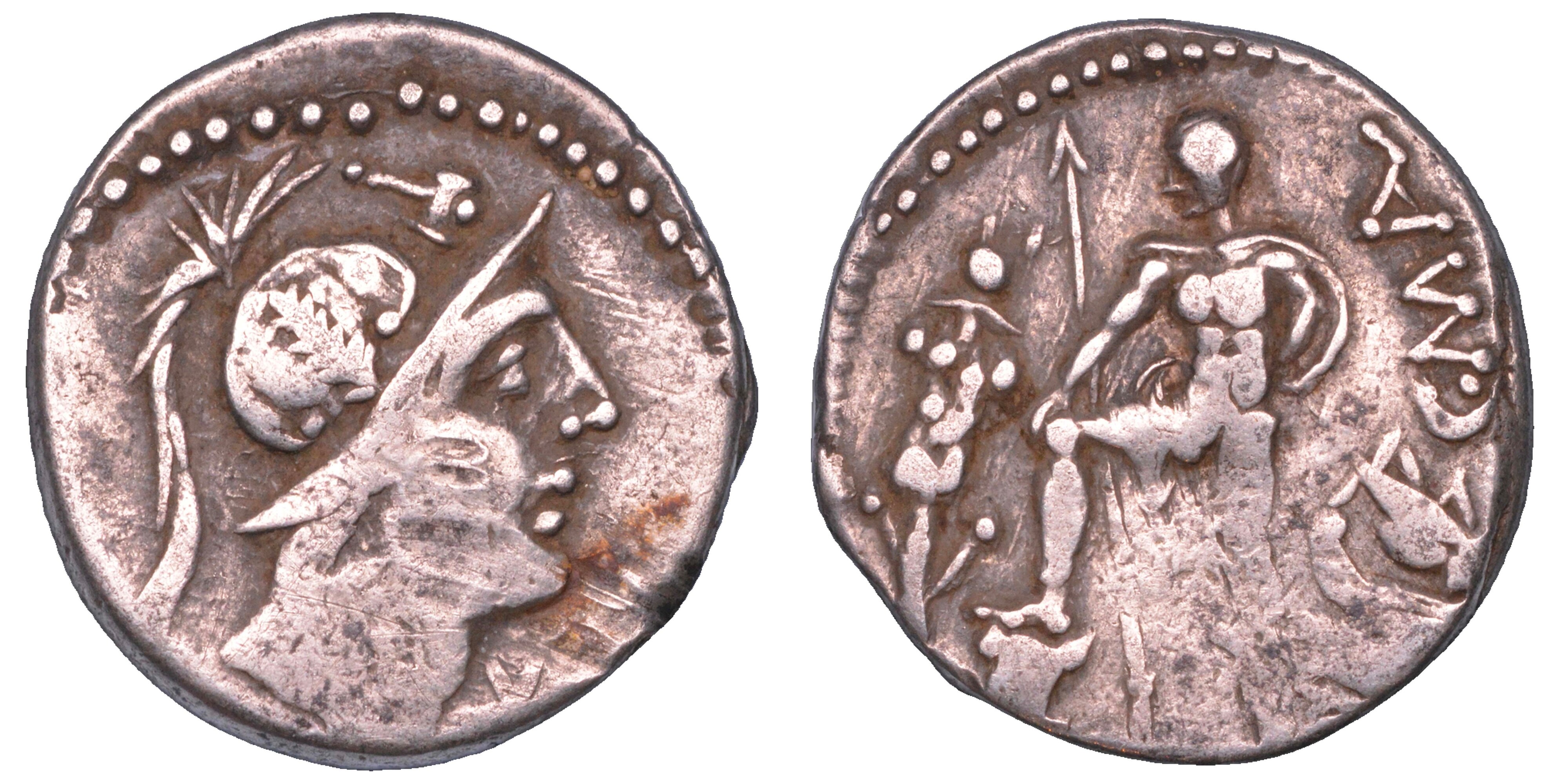 Busto elmato di Marte a d.; sopra, martello. R/ Giovane nudo in piedi a s., con lancia, davanti a un trofeo; piede appoggiato su un'armatura. Accanto a lui a destra, cavalletta. Bab. 6. Cr. 335/3d. Syd. 615 a.C. Rara. g. 3,89. Diam. mm. 18,70. Arg. MB