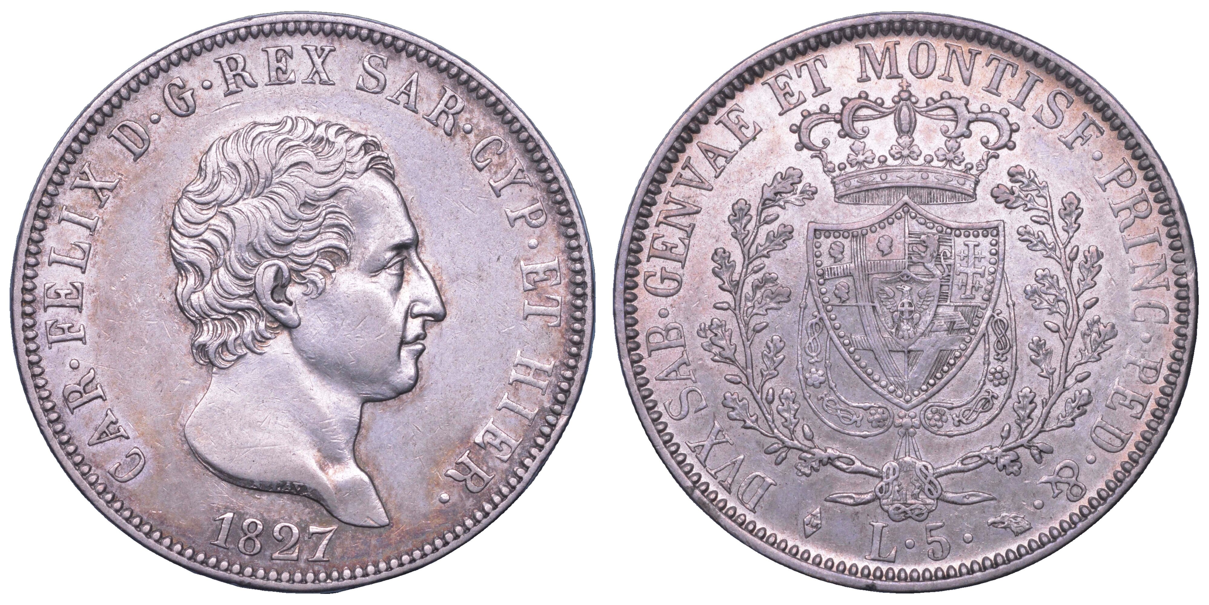 REGNO DI SARDEGNA. CARLO FELICE DI SAVOIA, 1821-1831. 5 Lire 1827. Torino.