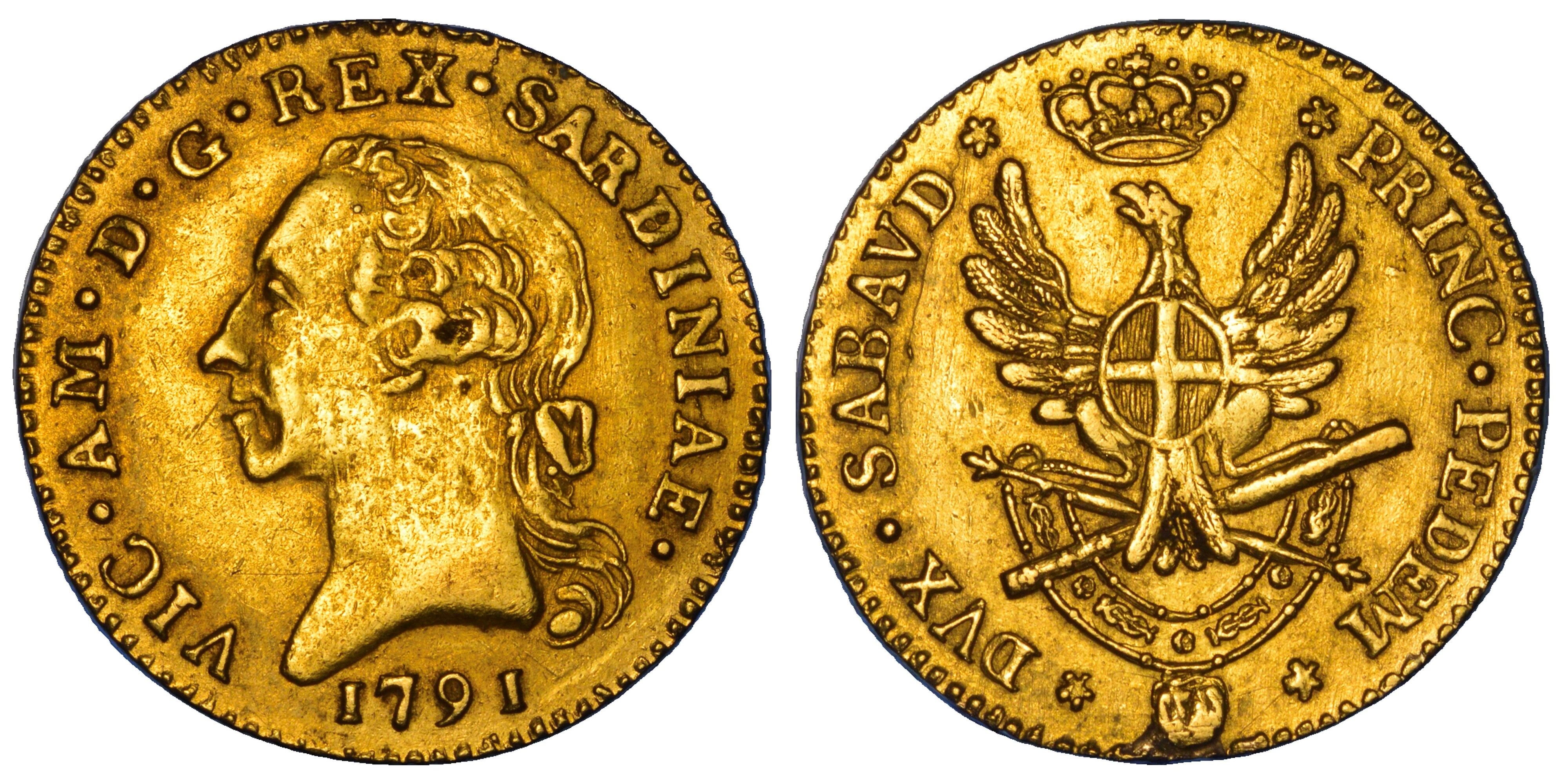 Testa de re a s., sotto, 1791. R/ Aquila spiegata e coronata, a s., con scudo in petto; negli artigli, bastone, scettro e Collare. MIR 982f. Biaggi 843f. g. 9,06. Diam. mm. 25,35. Oro. Traccia di appiccagnolo BB