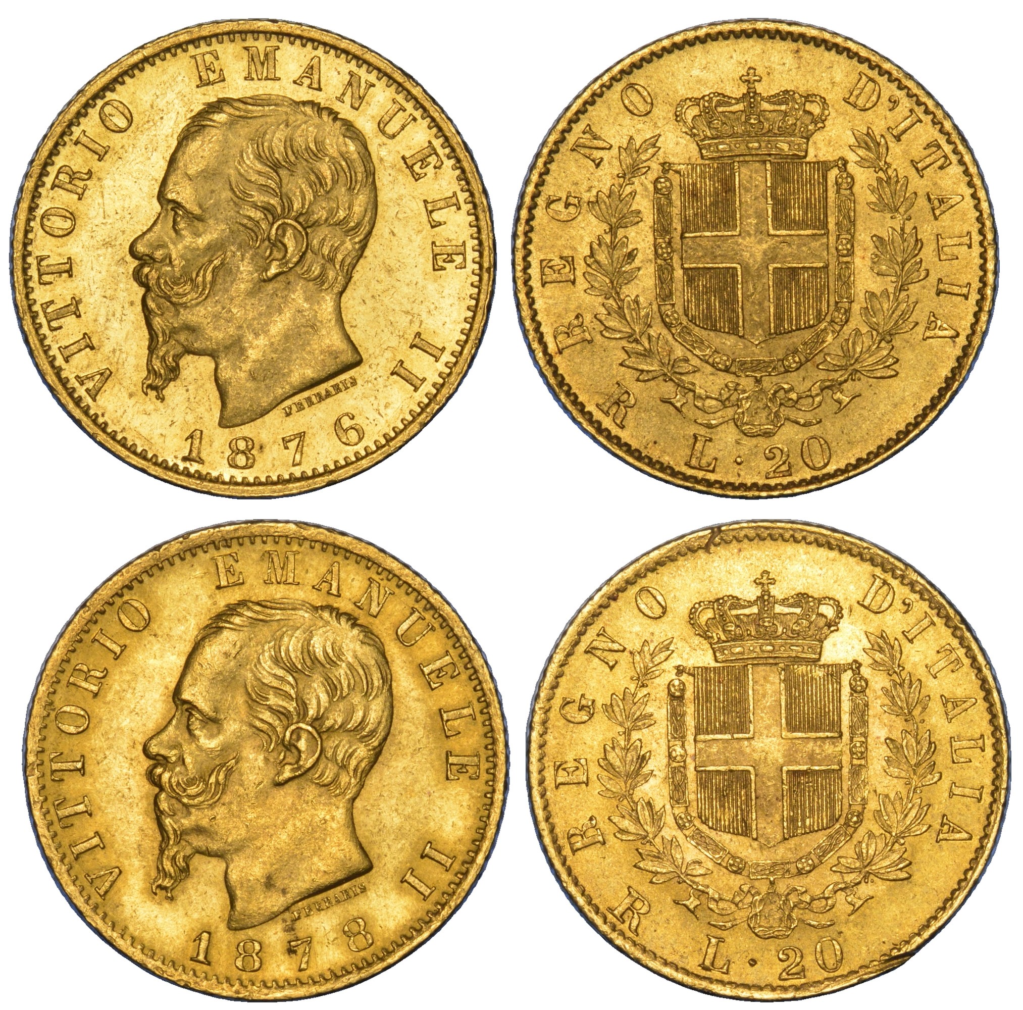 20 Lire 1876. Roma - 20 Lire 1878. Roma. Testa a s. R/ Stemma sabaudo coronato fra due rami di alloro. Gig. 23-25. g. 6,44; 6,43. Diam. mm. 21,24; 21,34. Oro. q.SPL; BB/SPL (lievi segni di contatto sui bordi).