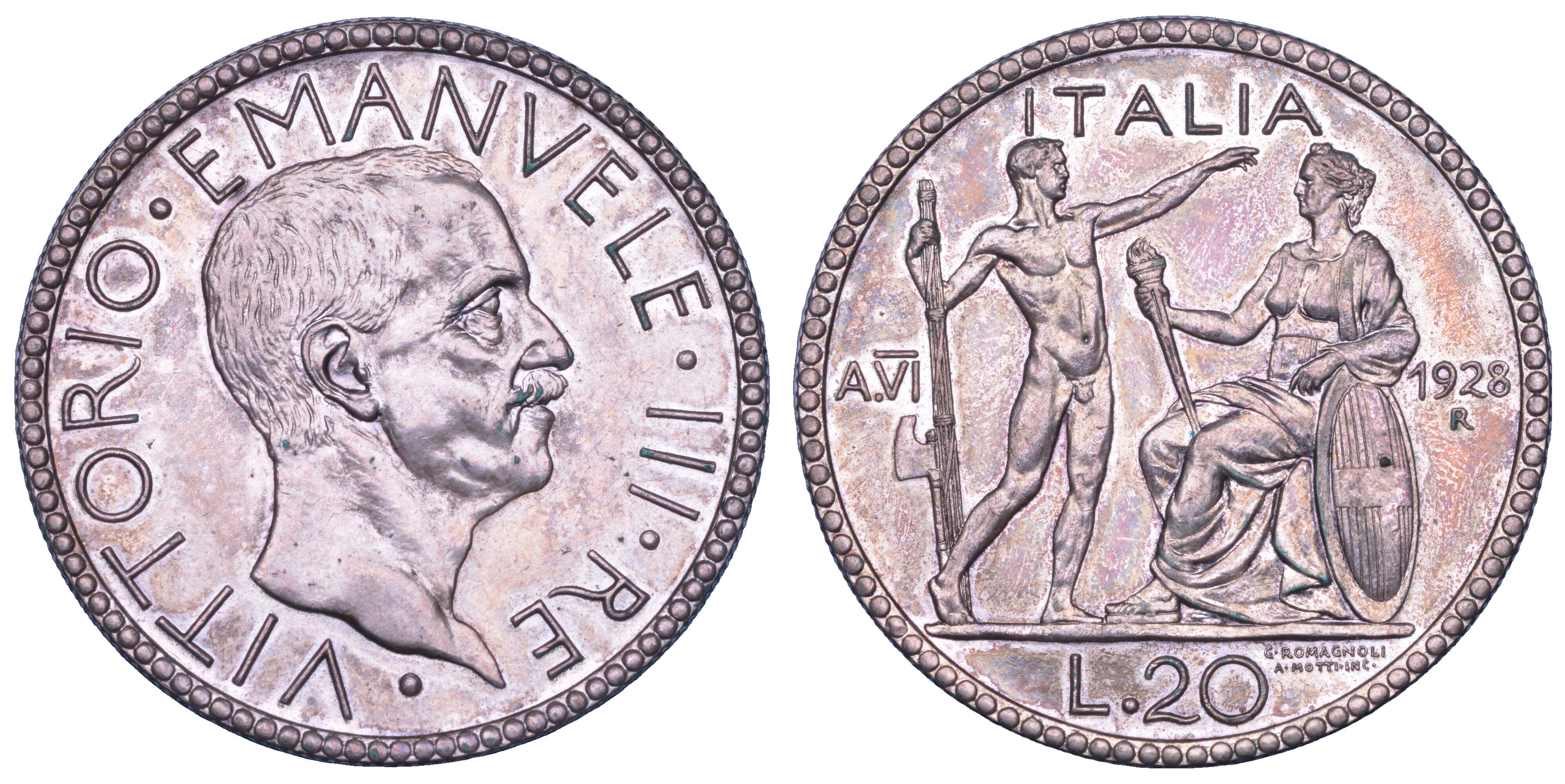 REGNO D'ITALIA. VITTORIO EMANUELE III DI SAVOIA, 1900-1946. 20 Lire 1928/A. VI.