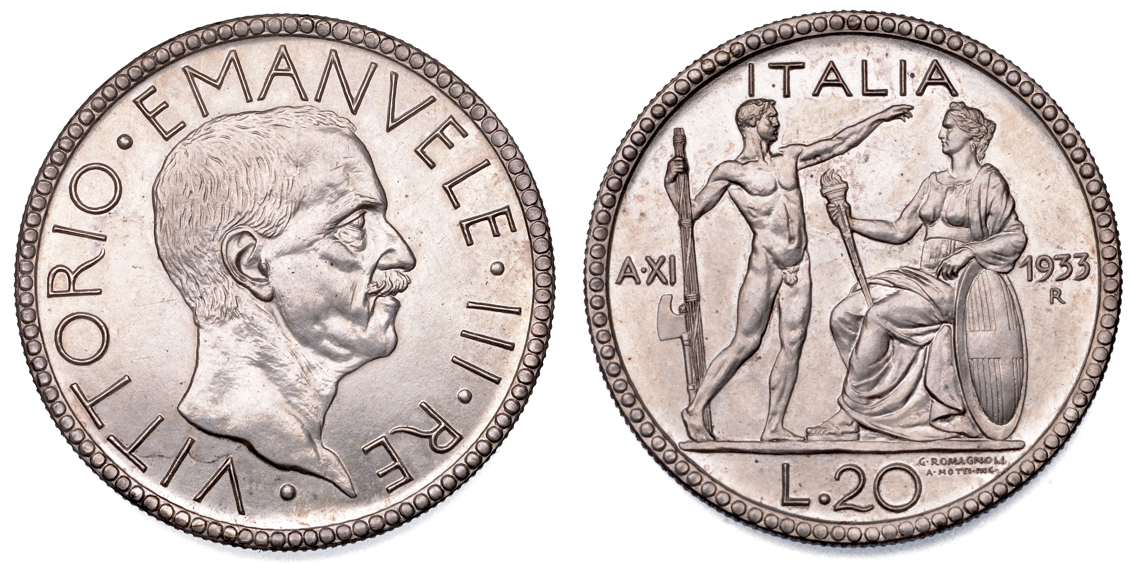 REGNO D’ITALIA. VITTORIO EMANUELE III DI SAVOIA, 1900-1946 20 Lire 1933/Anno A. XI. Littore. Emissione per numismatici.